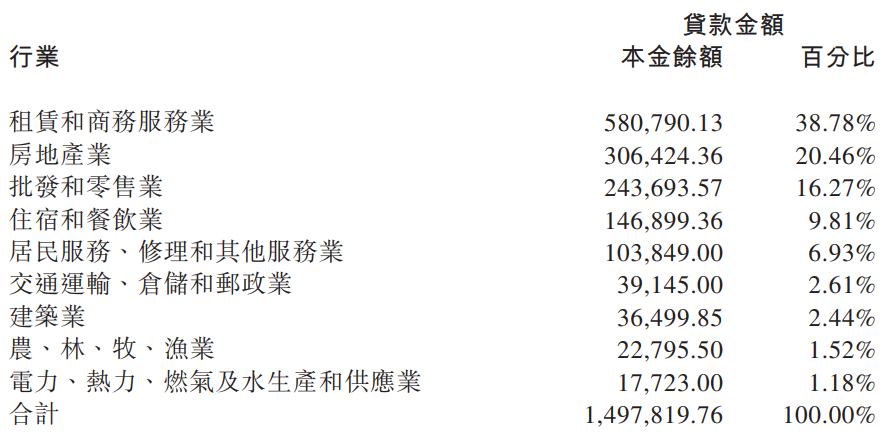 从行业分布来看,这笔信贷资产共涉及9个行业。其中,租赁和商务服务业、房地产业、批发和零售业的占比位居前三,分别为38.78%、20.46%和16.27%。