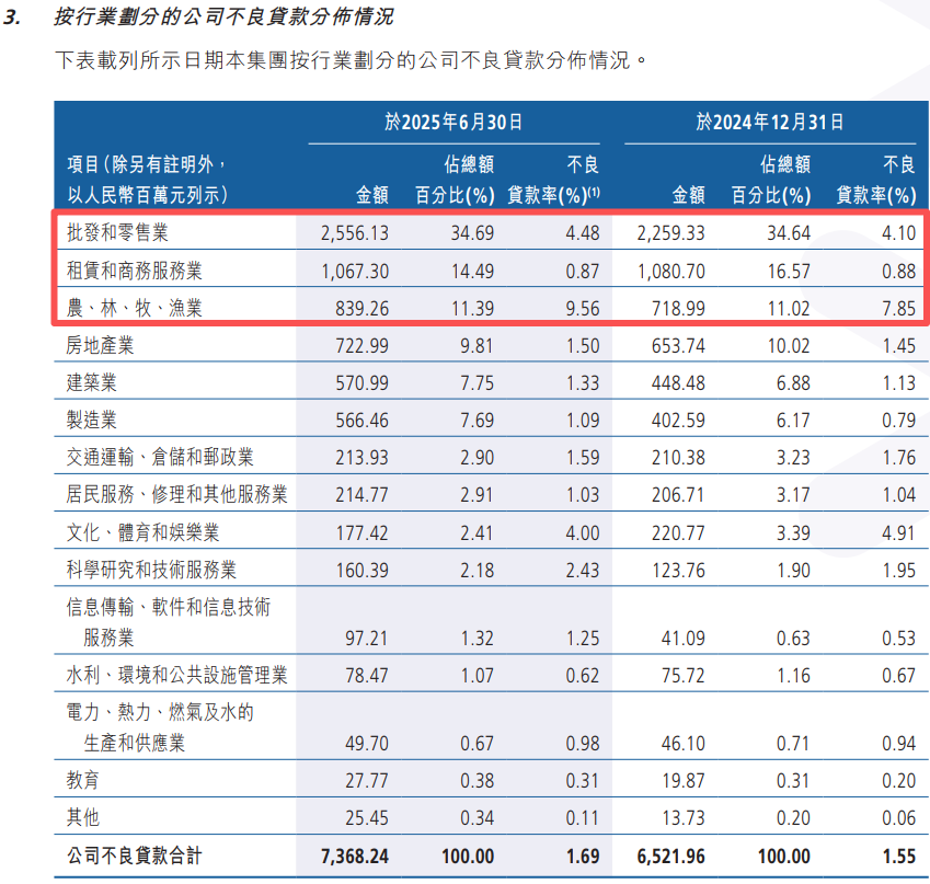 此外,从该行不良贷款的行业分布来看,截至2025年上半年,批发和零售业的不良贷款规模最高,达到25.56亿元,不良率为4.48%。