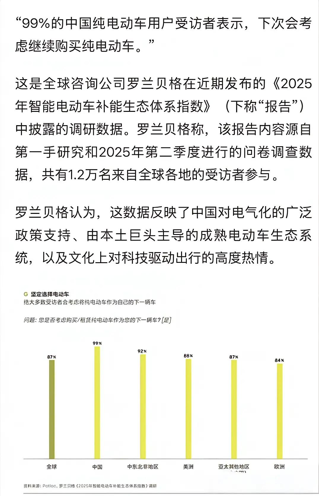 惊!99%电车用户考虑复购,背后真相竟是…… 最近,一份来自全球咨询公司罗兰贝格发布的《2025年智能电动车补能生态体系指数》报告,在汽车圈里掀起了惊涛骇浪!报告里显示,参与调研的1.2万名全球受访者中,竟有99%的中国纯电动车用户表示下次购车还会考虑纯电动车。这数据一出来,仿佛一颗深水炸弹,瞬间点燃了大家对电车的讨论热情。 就拿我自己来说,自从开上电车,真真切切感受到那种回不去的体验。以前开油车的时候,每次路过加油站,看着油价蹭蹭往上涨,钱包都跟着“滴血”,加油的几百块钱,够电车充好几个月的电了。而且电车启动快、加速平顺,没有了发动机的轰鸣声,车内安静得像个小图书馆,开起来别提多舒服。要是车子还有智能辅助驾驶功能,在堵车时自动跟车、保持车距,简直是通勤路上的“救星”。 再看看身边朋友,不少人也都有类似的感受。朋友小李,以前开油车时,每次保养都要花上大几百甚至上千,换个机油、滤芯,再检查下零部件,费用着实不低。后来换了电车,保养基本就是检查下轮胎、刹车,费用大幅降低。还有小王,经常要跑长途,一开始还担心电车续航不够,后来发现沿途充电桩越来越多,在服务区休息时顺便充个电,时间也不耽误,慢慢地也就习惯了。 从大环境来看,电车的发展势头也是锐不可当。如今大街小巷,各种品牌的电车越来越常见。这背后,政策支持可不少,购车补贴、免购置税、上牌容易,让大家买车的成本降低不少。而且,充电桩等基础设施建设也在不断完善,以前充电难,现在小区、商场、高速服务区,充电桩越来越普及,充电时长也在不断缩短。车企们更是在技术上疯狂内卷,续航里程不断突破,智能驾驶技术日新月异,像比亚迪的刀片电池、特斯拉的Autopilot辅助驾驶,都让电车的产品力越来越强。 当然,电车也不是十全十美的。部分车型续航里程会受天气影响,低温下电量衰减明显;二手车保值率相对较低;充电速度虽然在提升,但相比加油还是慢一些。但即便有这些不足,也挡不住大家对电车的喜爱。这99%的复购率,不仅是对当下电车发展成果的认可,更是对未来电车技术进步的期待。你呢,是坚定的电车拥护者,还是还在观望?评论区分享下你的看法吧!
