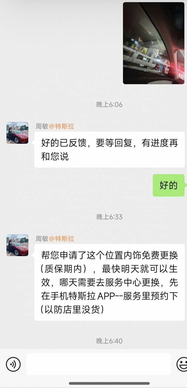特斯拉售后牛逼 因为拿补贴异地提车,本着对特斯拉的信任,去了办好手续直接开走了,回家途中发现顶棚有个黑点,然后就在群里通知售后,通知我们可以去售后洗一下,过了一周去店里洗了,没洗干净,然后就在群里反应,没超过半个小时通知我免费更换。这个售后太牛逼了,没有任何扯皮。 但是担心换顶棚会异响,纠结中,大家黑点意见