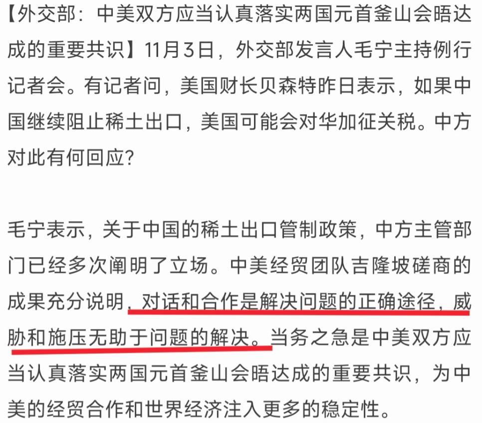 [微风]刚回国又变卦,贝森特威胁重新对华加征高关税,外交部回应了 美国财长贝森特前脚刚回国,后脚就变卦了。这出戏码演得,让全世界都见识了什么叫“翻脸比翻书还快”。 就在11月3日,中国外交部发言人毛宁在记者会上,面对记者的追问,冷静地回应了贝森特的最新言论,敦促美方落实中美双方前不久在釜山会晤达成的共识,给紧张的经贸关系降降温,多注入一些稳定性。这番不卑不亢的回应,与贝森特回国后的嚣张气焰形成了鲜明对比。 事情的导火索,是贝森特在当地时间11月2日接受采访时撂下的狠话。他声称,如果中国不解决所谓的稀土出口管制问题,那美国已经做好了准备,要重新对中国商品加征高额关税。 这话听起来耳熟不?简直就是几年前贸易战的老调重弹。要知道,他回国才三天,釜山会晤上那种“加强沟通、管控分歧”的和谐氛围仿佛还在昨天,转眼间就换上了一副要掀桌子的面孔。 这种“一卡脖子就翻白眼,一松手就吹牛皮”的做派,实在是把美国政策的不可预测性展现得淋漓尽致。 更让人啼笑皆非的是,就在贝森特挥舞着关税大棒的同时,美国白宫自己发布了一份情况说明书,里面却清清楚楚地写着,对华加征关税的暂停期将延长至2026年11月10日。 这可就热闹了,一边是手握钱袋子的财长叫嚣着要加税,另一边是总统府的白宫悄悄地递上“延期”的橄榄枝。美国政府内部这出“左右手互搏”的大戏,让外界看得是一头雾水。 大家不禁要问,美国的贸易政策到底听谁的?我们到底该信贝森特的威胁,还是该信白宫的文件?这种严重的政策信号矛盾,无疑让美国政府的信誉又被打上了一个大大的问号。 贝森特为何偏偏拿稀土说事?这背后可不是心血来潮。稀土不是普通的土,它是现代工业的“维生素”,从智能手机到精密导弹,从新能源汽车到风力发电机,几乎所有高科技产业都离不开它。 而中国在全球稀土供应链中占据着举足轻重的地位,无论是开采、冶炼还是分离技术,都有着绝对的领先优势。美国虽然也有稀土矿,但缺乏完整的加工产业链,长期以来高度依赖进口。 因此,当中国出于国家安全和可持续发展的考虑,对稀土相关技术出口进行管制时,无疑就戳中了美国的软肋。贝森特的威胁,本质上是一种“技术焦虑”和“供应链恐慌”下的歇斯底里反应。 这颗小小的“工业维生素”,如今却成了中美博弈棋盘上的一枚关键棋子,而棋手的心情,似乎比天气还变得快。贝森特的威胁,真的能吓倒人吗?恐怕未必。 经过这几年的贸易战洗礼,中国经济的韧性和抗压能力已经得到了充分证明。美国挥舞关税大棒,看似声势浩大,但增加的成本最终还是会转嫁到美国企业和消费者的身上,引发通货膨胀,拖累本国经济。这种“伤敌一千,自损八百”的招数,美国自己应该比谁都清楚。 那么,白宫为什么要唱反调,宣布延长关税暂停期呢?这或许反映了美国内部更复杂、更现实的考量。美国经济自身也面临着不小的压力,高通胀、高利率的问题尚未完全解决。 在这样一个节骨眼上,与中国彻底撕破脸,发动新一轮大规模贸易战,对美国经济而言无异于一场豪赌。许多依赖中国供应链的美国企业,包括特斯拉、通用汽车等巨头,都曾多次呼吁政府取消或减免对华关税,因为那笔钱实实在在地增加了它们的成本。白宫的“延期”决定,很可能是对这些国内经济压力的一种妥协和安抚。 这种“一个政府,两种声音”的混乱局面,恰恰是当前中美关系困境的一个缩影。它反映了美国对华政策的摇摆和矛盾:一方面,出于霸权思维和零和博弈的观念,总想在各个领域对中国进行打压和遏制;另一方面,又不得不承认中美经济深度捆绑的现实,无法承受“脱钩断链”带来的巨大代价。这种既想打压又离不开的纠结心态,导致了其政策上的反复无常和自相矛盾。 面对这样一个时而“鹰派”咆哮、时而“鸽派”安抚,甚至左右手互搏的对手,中国的应对之道就显得尤为重要。外交部的回应,其实已经给出了清晰的答案:保持战略定力,不被对方的言语挑衅所左右,同时坚持自己的原则和立场,敦促美方回到理性和务实的轨道上来。 毕竟,合作共赢才是双方唯一正确的选择,任何试图通过极限施压来获取优势的做法,最终都只会是搬起石头砸自己的脚。这场关乎未来的博弈,下一步又该怎么走?对于美国这种“精神分裂式”的贸易策略,你又有什么看法呢?