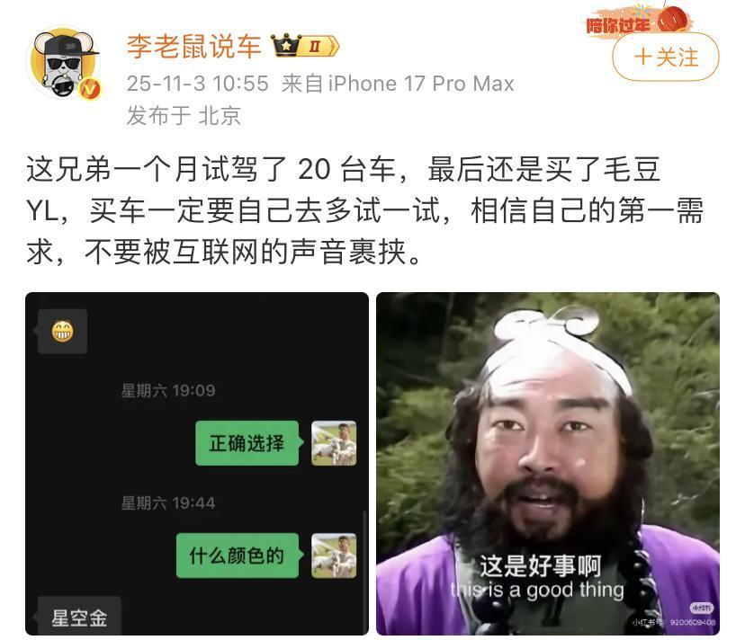 李老鼠说车:这兄弟一个月试驾了 20 台车,最后还是买了毛豆 YL,买车一定要自己去多试一试,相信自己的第一需求,不要被互联网的声音裹挟。 其实这个兄弟的想法是对的,毕竟每个人的需求不同,只有自己去多试一试,才能根据实际情况,选择适合自己的车型。不然什么都不看就听互联网上说的,去买个车然后自己又不满意。 互联网上大部分车评人说的内容其实都是有目的的,比如接受了相关厂家的充值,那肯定会为相关厂家说好话。 各位是怎么看的?欢迎评论区留言。