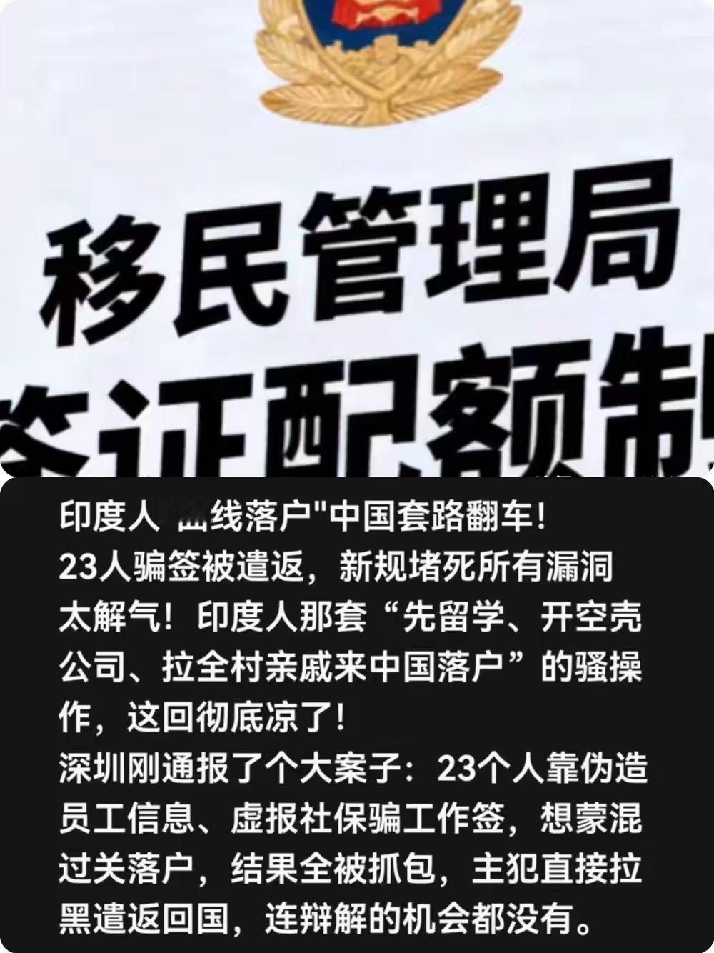 印度人曲线落户套路凉透了!23人骗签被遣返,这波操作真是大快人心! 别以为“留学开公司、拉亲戚落户”的歪招能蒙混过关,深圳刚抓的典型就是教训——伪造员工信息、虚报社保骗工作签,主犯直接拉黑遣返,半分情面不留。这哪是落户,分明是把中国规则当儿戏! 好在2024年移民管理局的“签证配额制”太硬核,纳税证明、实际工位、员工比例缺一样都拒签,空壳公司想造假门都没有。现在珠三角查得更严,广州、深圳窗口翻着银行流水核对,高校盯着“毕业就创业”的异常,67%存量违规案例要清掉。 但光堵漏洞还不够,得给正规渠道“搭梯子”。比如像A类高端人才那样明确标准,工资达标、纳税合规就给便利 ,让真人才有路走,歪心思没处藏。 毕竟宽容从不是纵容,你觉得接下来该给正规申请者加哪些便利?评论区聊聊~