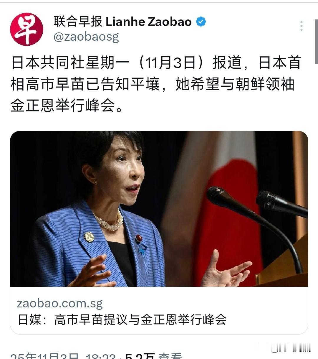 日本首相突然要见朝鲜领导,双方关系铁定变?背后藏着什么盘算。 日本首相高市早苗11月3日通过中间人告诉朝鲜要见面。这事被日本媒体报道后,网上很多人觉得她是在搞噱头。 高市这人当官不到半年,支持率一直很低。她总想着干点大事刷存在感,但朝鲜那边完全没回应。以前日本领导人想跟朝鲜接触都碰壁,这次更不可能。 朝鲜现在最缺钱,天天靠卖导弹零件活着。日本还天天喊制裁,双方早就翻脸了。高市就算真去了,估计连手都摸不着,就跟网友说的“别学她妈去送死”一样。 网上有人说她是想学特朗普博出名,但特朗普好歹搞成了几个协议。现在东亚局势更乱,这种面子工程根本解决不了问题,只能看笑话。