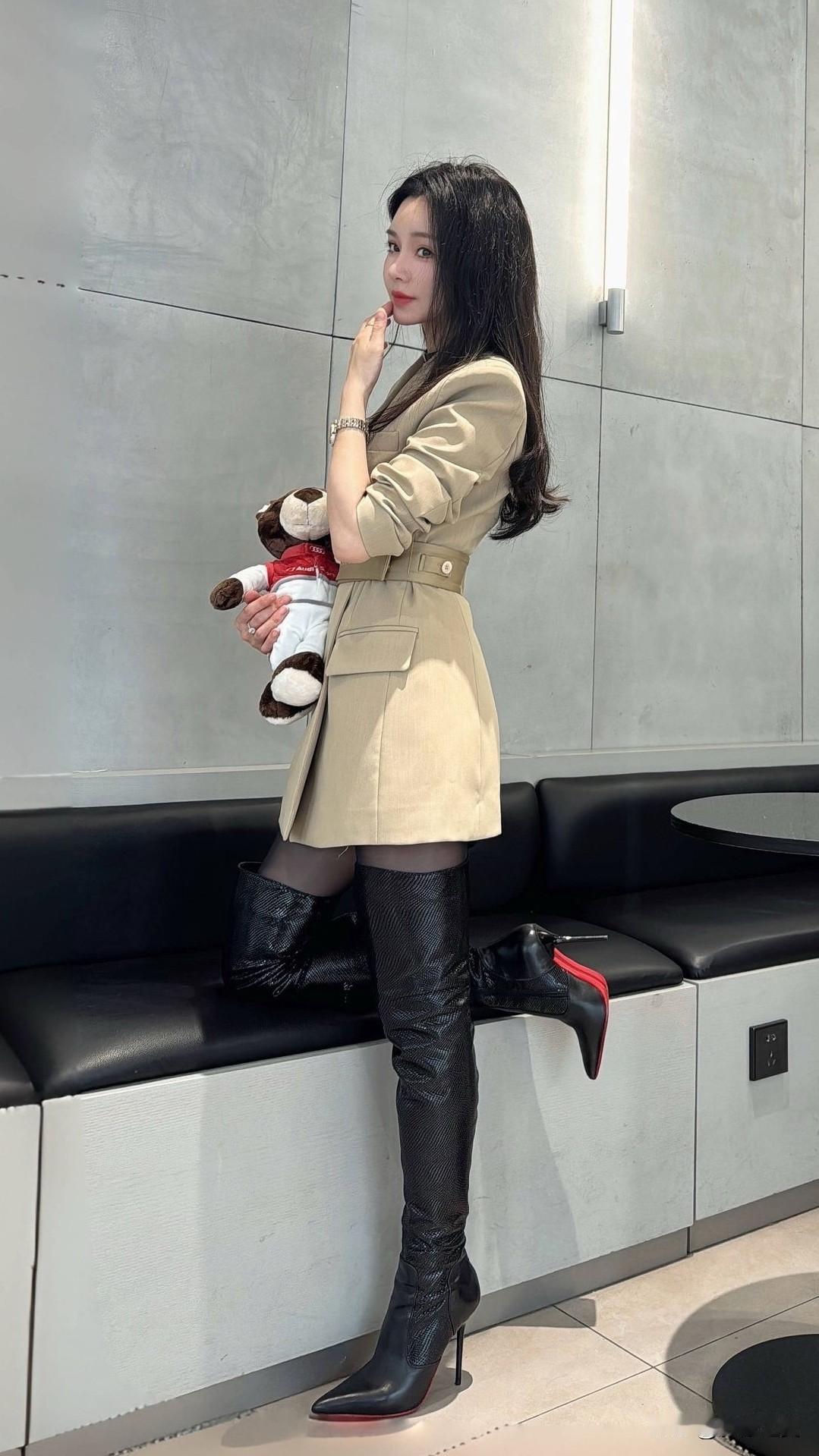 午后咖啡馆,米色西装裙配蛇纹过膝靴,干练优雅。阳光洒落,与小熊玩偶相伴,慢享惬意