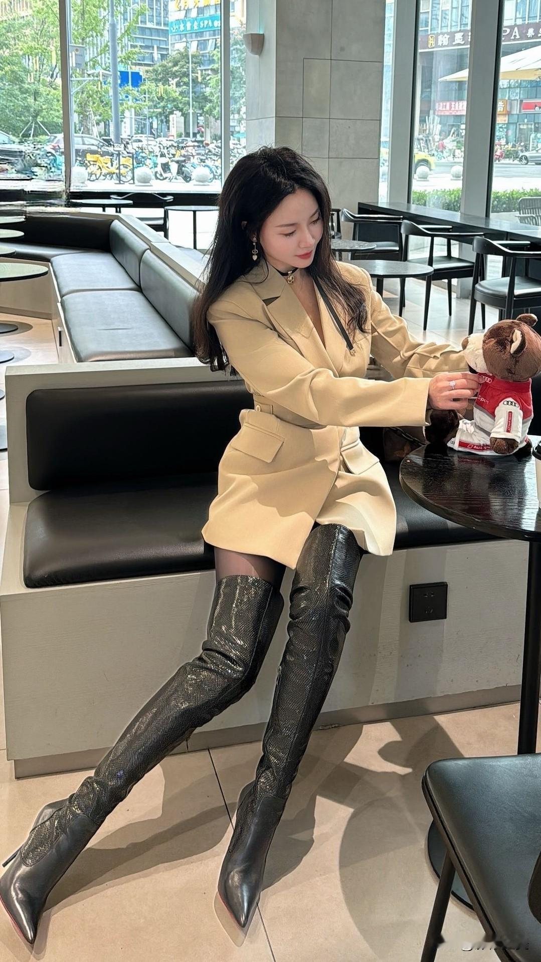 午后咖啡馆,米色西装裙配蛇纹过膝靴,干练优雅。阳光洒落,与小熊玩偶相伴,慢享惬意时光。