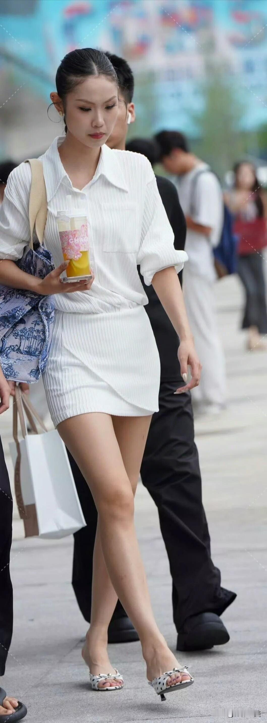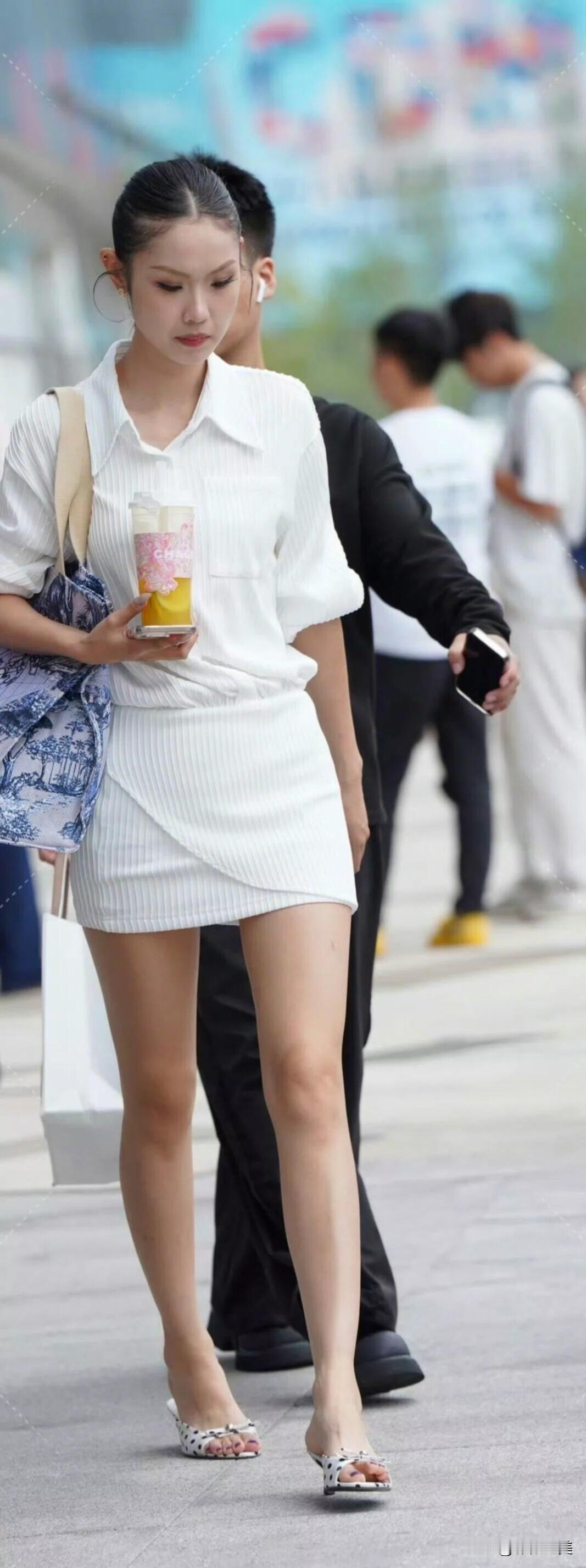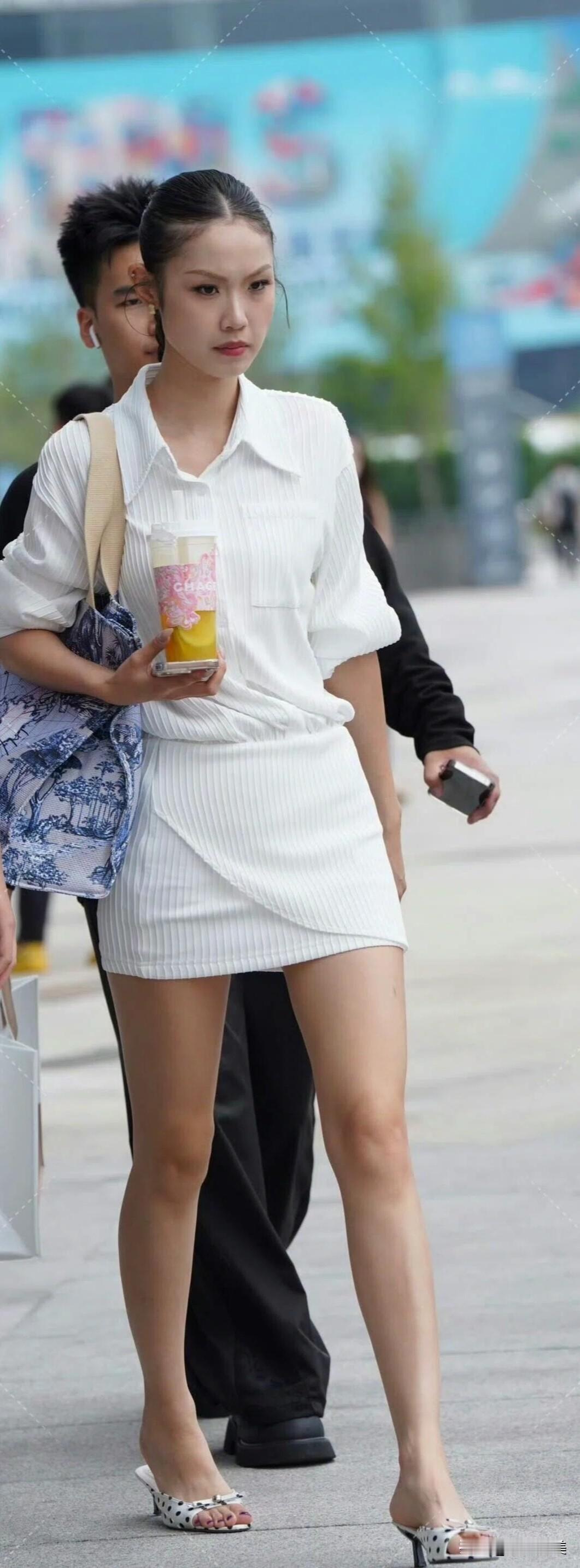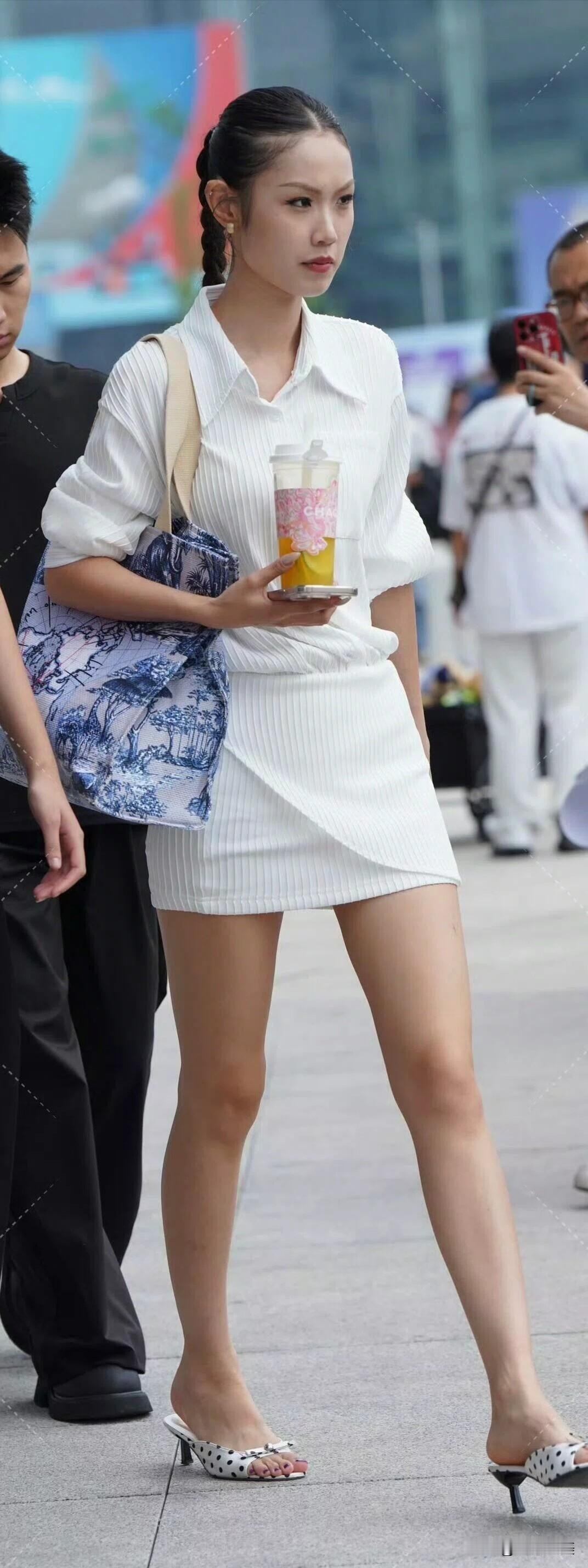 街头偶遇一身白裙的时尚女孩,利落编发搭配波点高跟,手提饮料与印花包,简约又高级,气质尽显。
