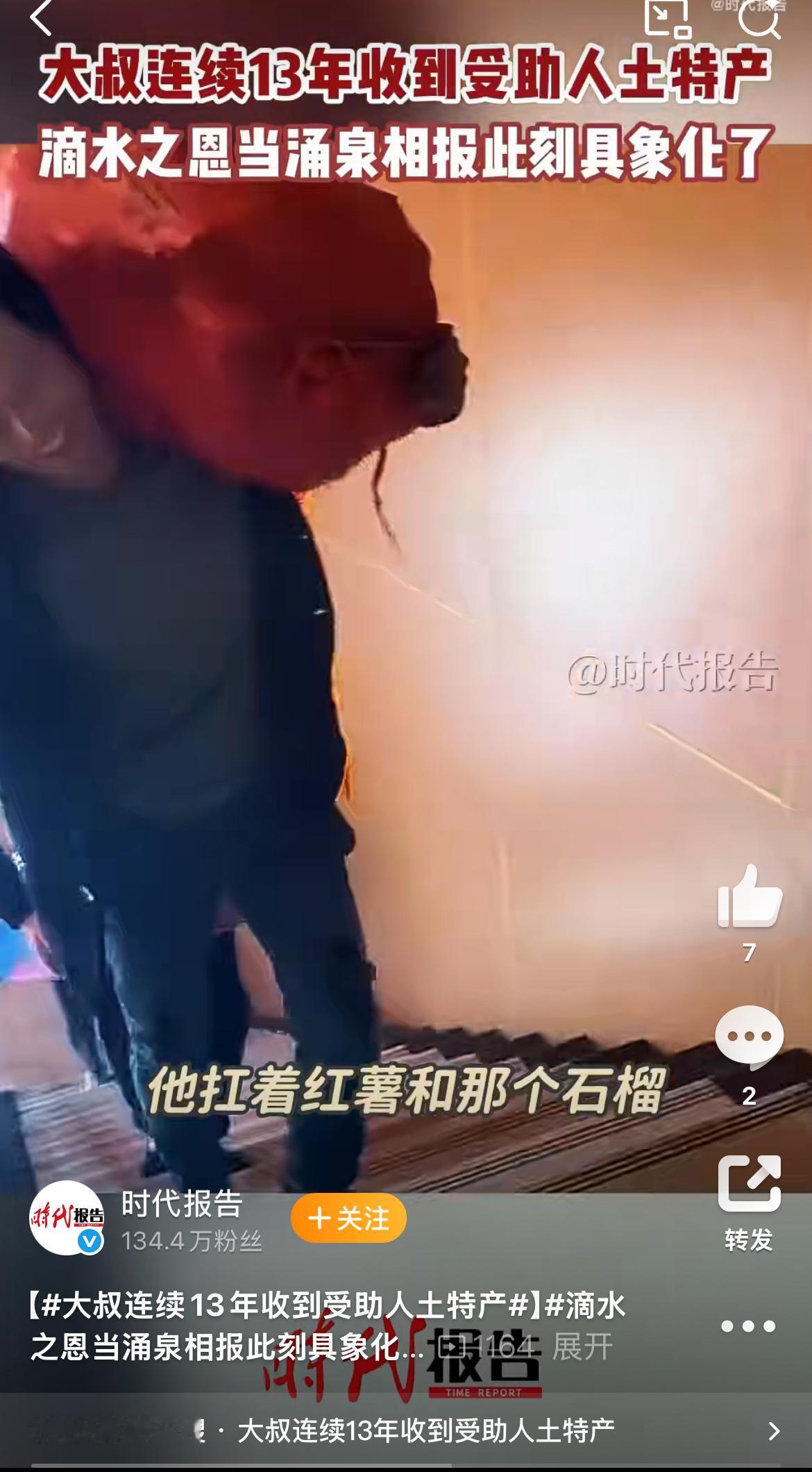 看到这个新闻,心里真是暖暖的。一位西安的大叔,因为13年前的一个善举,竟然换来了一位兄弟连续13年、每年一麻袋红薯和四箱石榴的不变感谢。这早已超越了简单的礼尚往来,成了一段珍贵的兄弟情谊。 故事要追溯到2012年。那时,王先生种的白菜大丰收,却偏偏遇上市场低迷,好几万斤白菜眼看就要烂在地里,这几乎是他一家全年的指望,那些夜晚他愁得根本睡不着觉。同样在西安的张先生,从媒体报道中得知了这个消息。他自己也是农村出身,特别能理解农民种地的辛苦和蔬菜滞销的焦虑,于是立刻通过媒体联系上王先生,不仅去地里看了情况,还找来车和工人,把滞销的白菜全部收购了,解了王先生的燃眉之急。对于张先生来说,这可能只是力所能及的一次帮忙,但在王先生心里,这份恩情重如山。他当时就说:“得知菜被人买了,我那晚睡得很香。” 这份朴素的感激之情,王先生没有停留在口头上。就是从第二年开始,他用自己的方式开始了漫长的回报。他记得张先生当初随口夸过一句他家的山地红薯不错,就把这话牢牢放在心上。每年秋天,自家地头种的红薯、石榴成熟了,他总会精心挑选出最好的,雇上车从几十公里外的临潼送到西安张先生的办公室。更让人感动的是,王先生每次来都像是“悄悄进行”,常常放下东西转身就走,连句谢谢的机会都不太想留给张先生,生怕多打扰对方。这一送,就是十三年。这些年里,两家的联系早已超越了单纯的“报恩”。他们平时会通电话、发信息问候,逢年过节相互走动,张先生还招待过王先生和他的老父亲。用张先生的话说,他们从陌生人变成朋友,最后处得“比亲戚还亲”。王先生的生活也渐渐好了起来,孩子长大了,家里条件改善了,但这份每年送特产的心意从未间断。 这件事最打动我的地方,就在于它是一场美好的“双向奔赴”。张先生的善良遇到了懂得感恩的王先生,于是,善良开出了最持久的花朵。这让我想起一句话:世上所有的惊喜和好运,都是你积累的善良和人品。张先生当初的举手之劳,像一粒种子,在王先生心中生根发芽,最终长成了情谊的大树。而王先生的坚持,也让我们看到,最真挚的感情往往就藏在年复一年、看似笨拙的行动里。这不就是我们常说的“投我以木桃,报之以琼瑶”吗?在这个有时候显得有点冷漠的世界里,这样的故事特别珍贵。它告诉我们,善良从来都不是单向的付出,你付出的善意,终会以某种温暖的方式回流到你身边。这种人与人之间最纯粹的信任和情义,比任何东西都珍贵。 不知道你身边是否也有这样因为一次善意而结下的长久情谊?欢迎在评论区分享让你感动的温暖故事。社会感动故事 陕西好人好事 西安暖心事迹 来源:时代报告