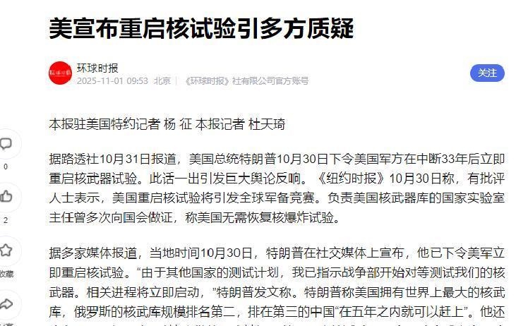 快讯!快讯! 特朗普突然宣布了。 10月31日这个时间点,他在社交平台放出“指示五角大楼立即重启核试验”的说法。需要说明,这不是美方正式决定,尚无权威机构发布配套文件,美军体系也不以此为执行依据。 先把基本盘摆清。美国自1992年起就没有进行过核爆试验,一直靠计算机建模和亚临界实验维持弹头可靠性。美方核安全机构和实验室多次公开强调,现有手段足以支撑库存安全,无需恢复实爆。这是一条硬事实。 再看可操作性。内华达试验场冷置三十多年,设施恢复、人员再训练、环境评估环节一个都少不了。多名专家评估,即便走最快路径,也要花很长时间,不存在“立即”两字能解决的现实路径。 把量级对上号更重要。按SIPRI在2024年发布的数据,全球核弹头总量约1.25万枚,美国库存约3700枚,已部署约1770枚;俄罗斯部署规模与之相近;中国约500枚,维持克制规模。对比之后就知道,动辄把“紧迫威胁”挂在嘴边并不贴合客观数字。 美国这几年本就推进核力量现代化:新一代陆基导弹LGM-35A计划在2030年代逐步接装,B-21轰炸机已经首飞推进入列,空射远程巡航能力按计划接续;海上则由“哥伦比亚”级在2030年代替换“俄亥俄”级。流程是按部就班的,不靠一条社交媒体口号。 把镜头切回我们自己的路。中国自1996年起暂停核试验,长期坚持不首先使用核武、维持最低限度自卫需求。2019年东风-41亮相,固体机动、多弹头,提高了生存与反应效率,这是公合看得到的建设节奏。 陆基之外,海上巡航值班也在稳步推进。094型潜艇搭载巨浪-2执行战备任务的信息早已公开,目的很明确,就是保证可靠的二次打击能力,保持稳定和可预期的安全边界。 把双方节奏放在一张时间轴上就更清楚了。美国的民兵-3服役年代久、维护成本高,新项目成本爬坡、工期拉长,这是现实难题;中国的建设则是按需求扩充、按节点生成,不追求数字堆叠,也不搞冒进。 条约环境同样是关键变量。《全面禁止核试验条约》美国签署未批准、中国签署未批准,双方都维持了长期暂停试验的做法;《新削减战略武器条约》将在2026年2月到期,留给各方的空间不多,任何一方抬高动作幅度,都会让技术与互信的门槛更高。 把核试验当话筒,短期能制造声量,但技术、法理、设施三道门一道都绕不过。对外喊话容易,落到执行层,步骤、资金、时间表都要能对上。 在这种背景下,中方继续强调支持全面禁试目标、维持暂停试验共识、保持核力量的可靠和克制,这三点是一条线,内外一致,执行得稳。 最后把话说直了:谁要把实爆核试验当作谈判筹码,投入产出比并不划算,附带风险还很高。把现有共识稳住,把已在路上的现代化项目做好,才是对各方都最低成本的选择。