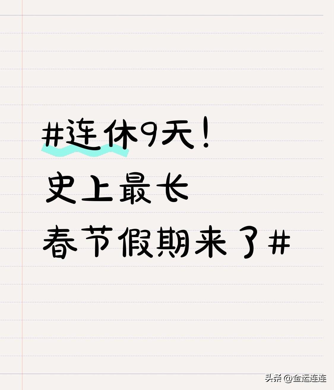 连休9天!史上最长春节假期来了 2025都快过完了,不少人已经眼巴巴盼着2026年春节了。这不,好消息来了!国务院公布2026年放假安排,春节2月15日至23日连休9天,堪称“史上最长”。虽说前后要调休两个周六上班,但这9天假期太香了。而且,这次腊月二十八和除夕都放假,能提前两天准备年货、走亲访友,想想就美。2025年起春节假期增加1天,这次又拼出长连休,真是贴心。就是国庆为了7天连休要调休个周日,有点小遗憾,不过总体瑕不掩瑜。坐等2026春节嗨起来!