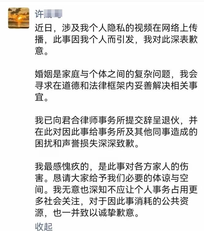 上海许律师朋友圈道歉了 他说对不起家人,这算啥?挺让人迷惑的,我觉得人家毕竟是律师,得注意点形象么,律所也辞职了,离婚也离了,毕竟网上的舆论压力太大了[捂脸][捂脸] 道歉这事,网上好多人也觉得不对劲,不像真心悔过,像是怕了,怕自己倒霉,律所肯定也不高兴,毕竟利益受损了,直接解除合同,这下好了,经济损失肯定少不了,社会谴责也躲不掉,道歉是迫不得已,真不像是发自内心。 这事影响太大了,真是一环扣一环,职业生涯受损,律所都不要他了,以后谁还敢请,家庭也完了,还可能面临更惨的,净身出户,律师执业证也可能被吊销,这代价太大了,一开始没想着后果,现在后悔也晚了。 总之一句话,早知现在何必当初!!!!