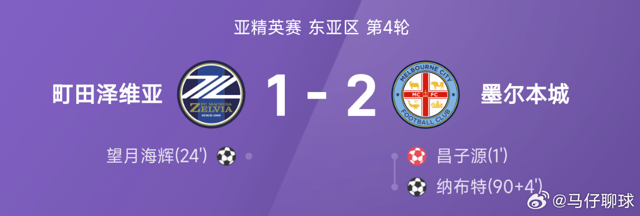11月04日讯 25/26赛季亚精英赛东亚区第4轮,墨尔本城2-1战胜町田泽维亚,纳布特第90+4分钟上演绝杀。全场比赛,纳布特破门建功,望月海辉破门难救主,昌子源自摆乌龙。亚冠精英墨尔本城