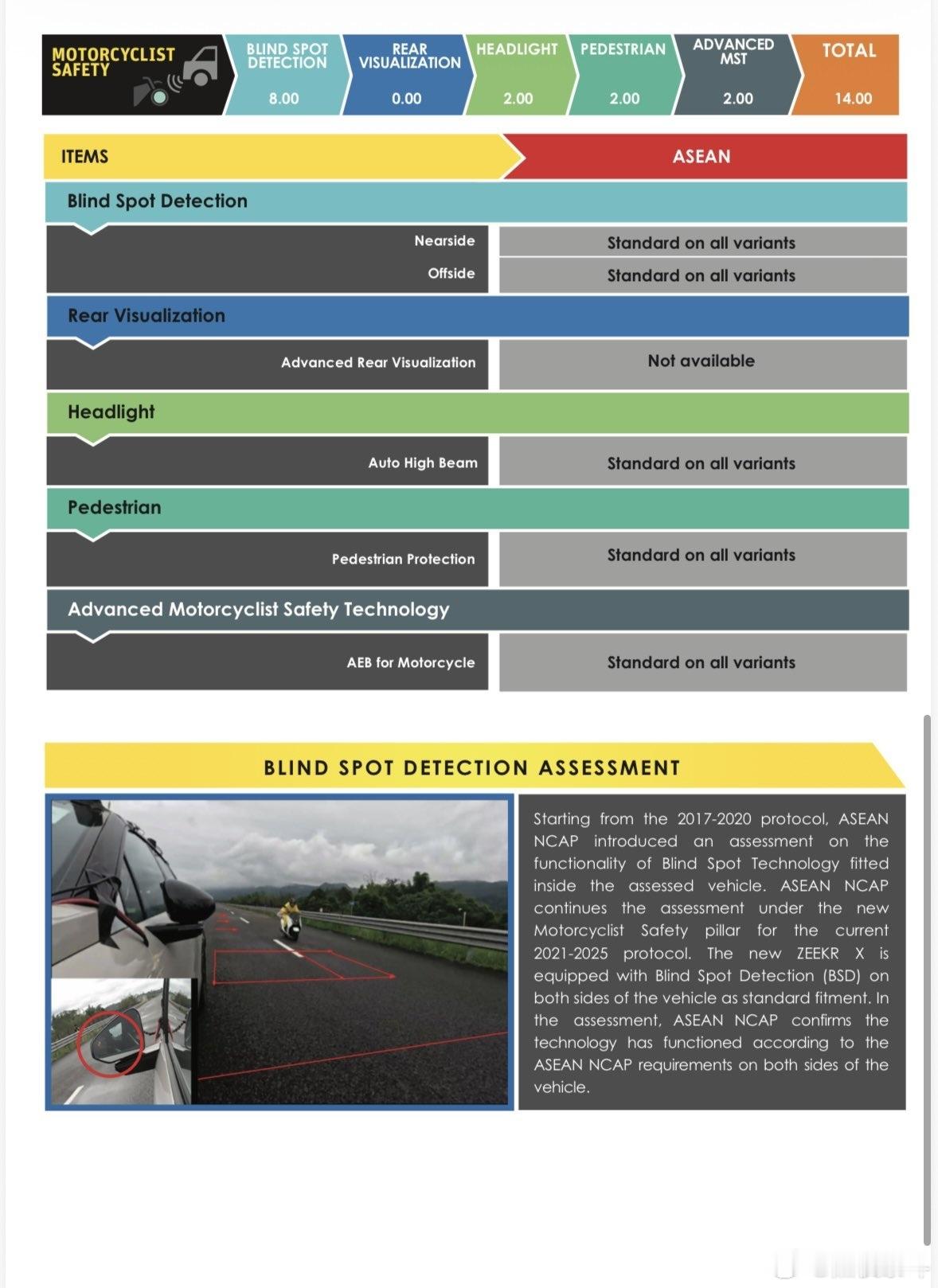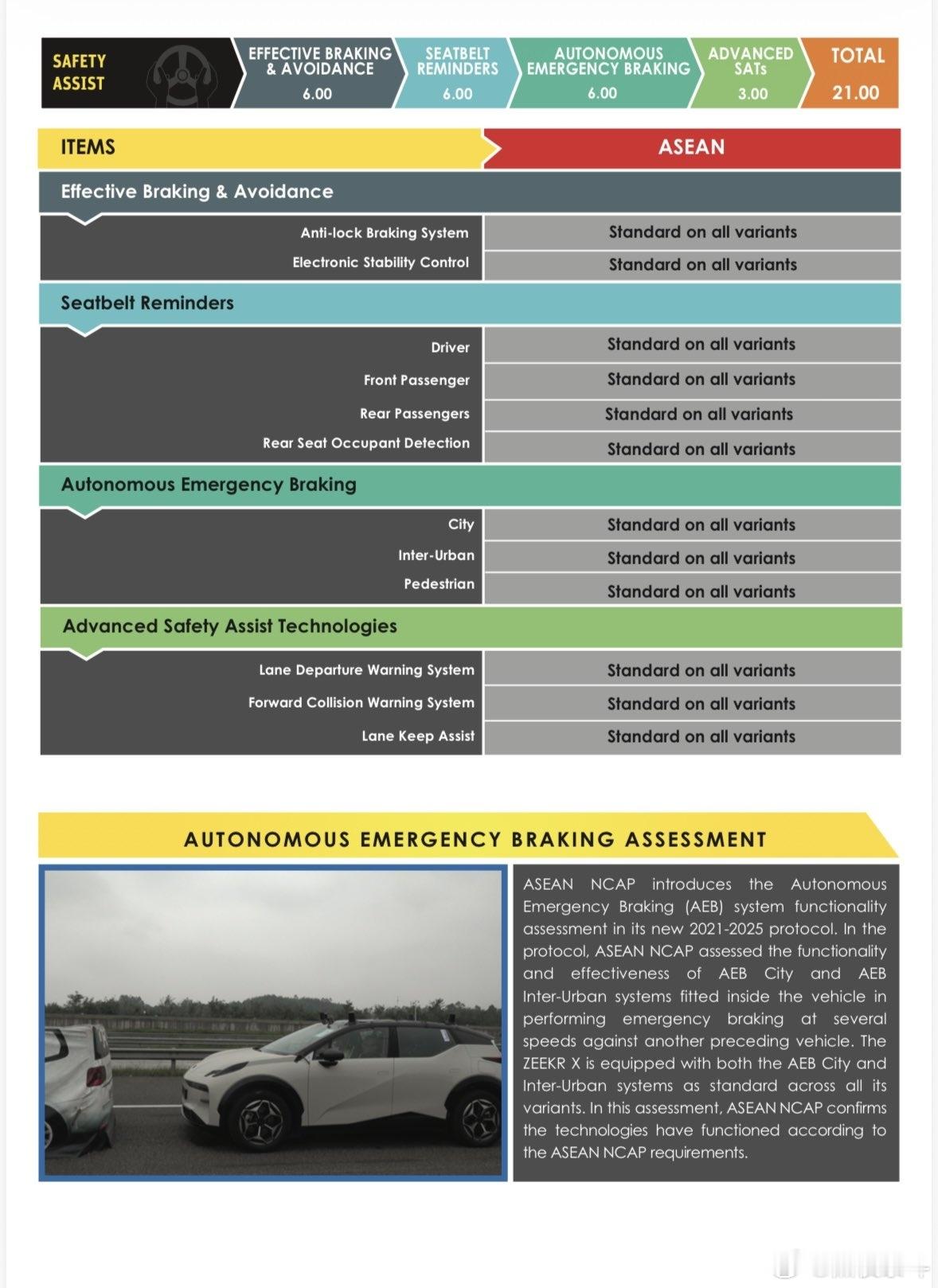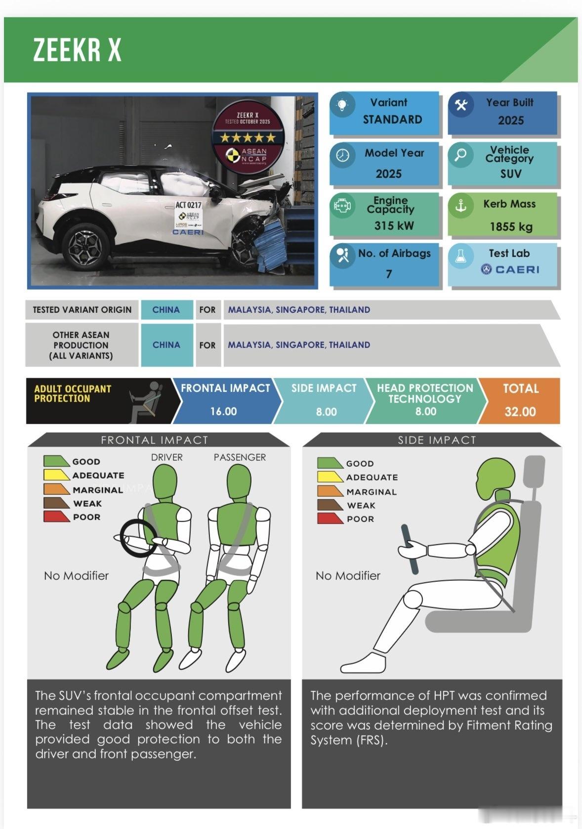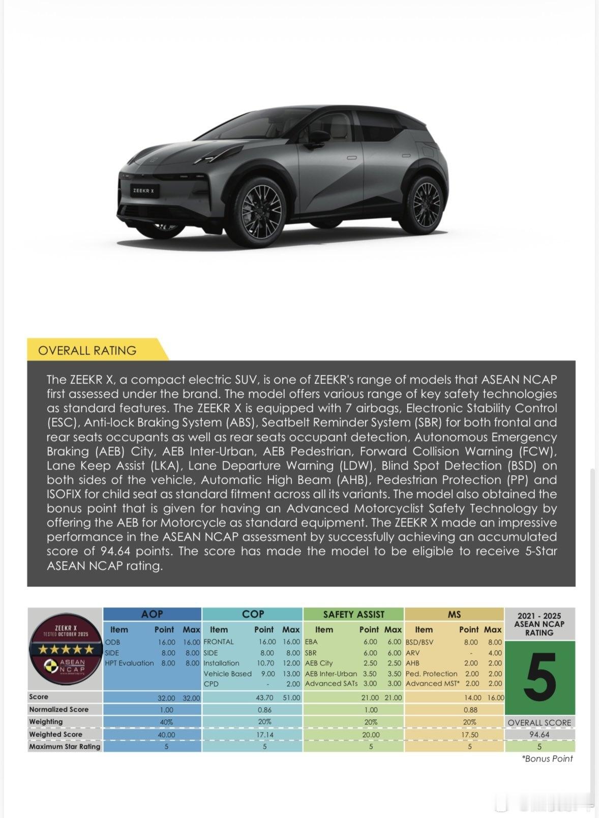 东盟新车安全评鉴协会(ASEAN NCAP)对新款ZEEKR X的最新评估结果。