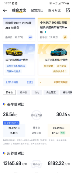 价格差不多,是选小米SU7还是买凯迪拉克 看了大半年的凯迪拉克CT5尊贵,准备订车了,偏偏看了小米SU7 的新品发布,脑壳一热,直接定了SU7顶配板,刚开始觉得还不错,等到自己喜欢的车了,但这才过了半个月,我就后悔了,本来一年就开不了多少公里,我选个纯电的干嘛,车子贬值高,电池使用寿命短!油车多方便啊,几分钟加满油,满血上路,5000块钱定金估计要凉凉了,后悔死了,估计我要去提凯迪拉克CT5了