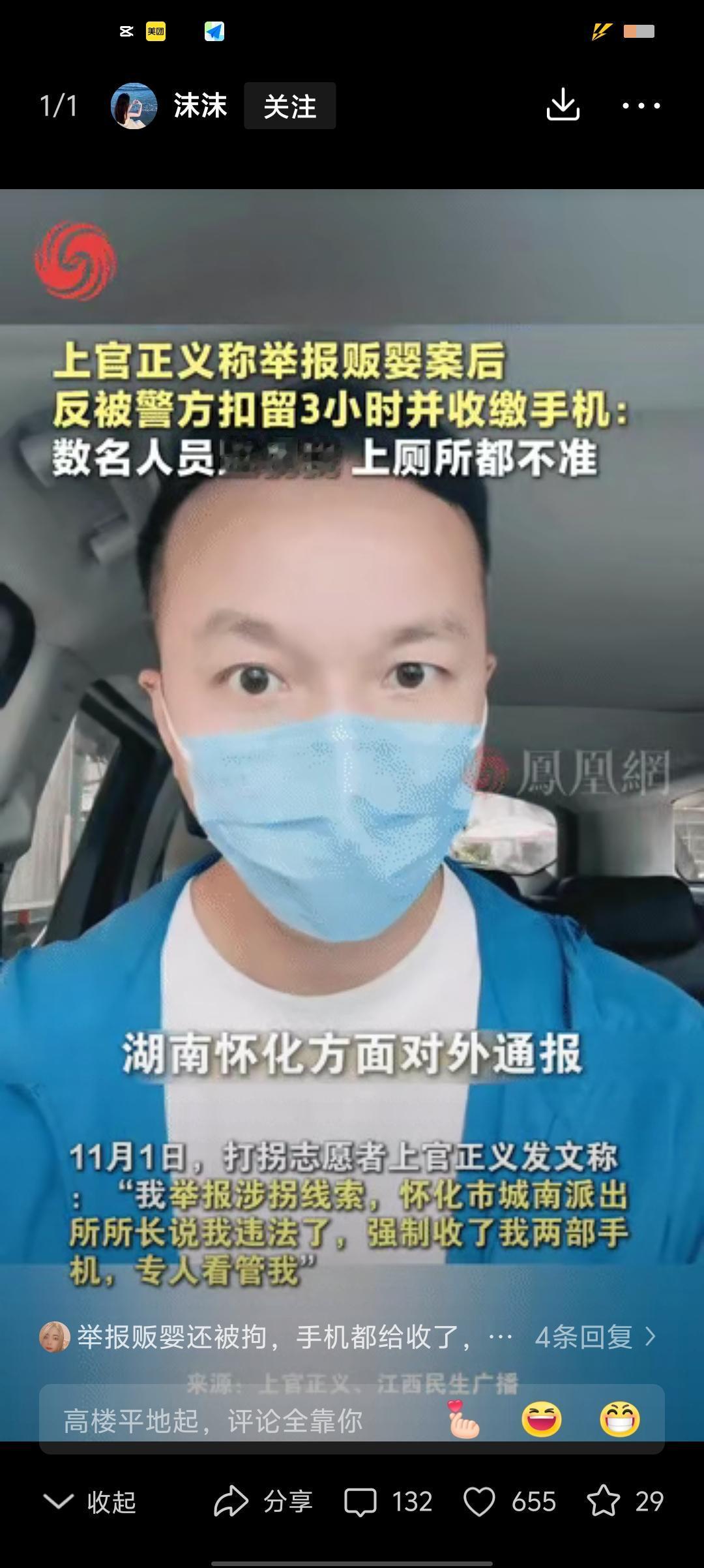刚刚刷到上官正义最近在湖南怀化做打拐志愿者被扣留三小时,手机被没收,当地叔叔说他违法了,但李圣律师表示质疑,称这种为找失踪儿童拼命的人都在被限制,实在说不过去。 有网友说:这种情况确实引发了人们的关注和思考。 打拐工作是一项极为重要且艰巨的任务,上官正义等志愿者为寻找失踪儿童付出了巨大的努力和心血,他们的行动对于那些被拐儿童及其家庭来说可能意味着重获希望。 而当地相关部门扣留志愿者三小时并没收手机且称其违法,这需要有明确的法律依据和合理的解释。如果没有充分的理由和合法的程序,这种行为可能会让人对执法的公正性和合理性产生疑问。 李圣律师的质疑也反映了公众对于此类事件的关切,在维护社会秩序和保障公民合法权益之间,需要找到一个平衡。一方面,执法部门有责任维护法律的尊严和社会的稳定;另一方面,也不能忽视那些为了正义和公益事业而努力的人的权益和贡献。 对于这样的事件,应该进行深入的调查和评估,以确保执法行为的合法性和合理性,同时也鼓励更多的人参与到打拐等公益事业中来,共同为保护儿童权益、维护社会安全而努力。 拿着纳税人的钱,就应该为人民服务,党委以重任就应该维护法律尊严维护党的利益!保护人民平安幸福,安居乐业!做不到的应该退出岗位,让贤与人! 本来怀化很“太平”的,被他把遮羞布拿掉了,还给警方找了“麻烦”——多一事不如少一事嘛,劳心费神的,不收拾他? 希望国家彻查背后黑幕,严惩黑心办案人员玩忽职守,滥用职权,徇私枉法,还天下一个朗朗乾坤。 如果报道属实,只能说明这人多管闲事,干好自己的事自求多福算了,好人不一定好当。 大家怎么看呢?