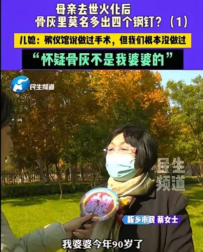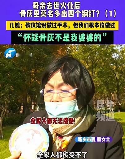 90岁老人火化后,骨灰里惊现4颗钢钉?殡仪馆嘴硬说“做过手术”,可医院证明和家属日常照料都戳破了谎言,这哪是失误,分明是踩碎了逝者最后的尊严! 河南这位老人因病离世,家人按规矩送殡仪馆火化,满心只想让老人早点和老伴合葬,入土为安。可儿媳王女士打开骨灰盒的瞬间,眼泪当场就崩了——洁白的骨灰里,4颗指甲盖大的钢钉格外刺眼。 全家瞬间懵了,老人从没做过手术,每天伺候擦洗的儿媳再清楚不过,身上连个疤痕都没有,医院病历更是白纸黑字写着“无手术史”。找殡仪馆要说法,对方倒省事,一句“估计是以前手术留的”就想打发,被反驳后又硬扛“全程闭环管理,绝不出错”。 这话说得也太心虚了!家属要查监控、看登记记录,殡仪馆立马拿不出来,所谓的“闭环”根本就是自欺欺人的空话。钢钉总不能是火化炉自己长出来的?要么是遗体进馆时就弄混了,烧错了人;要么是上一具遗体烧完没清理炉膛,把残留物混了进来,不管哪种都是殡仪馆的失职。 咱老百姓最讲“逝者为大”,骨灰是活着的人对亲人最后的念想。家人本来就沉浸在丧亲之痛里,这4颗钢钉直接把“让老人安心走”的心愿搅得稀碎,甚至要怀疑“亲人是不是连最后一程都没走安稳”。更戳心的是,骨灰一旦弄混很难鉴定,因为高温早破坏了DNA,到时候连找回来的机会都没有。 有人说“每天烧那么多人,难免出错”,这种话简直站着说话不腰疼。《殡葬管理条例》明明白白要求,遗体接收、火化确认、骨灰交接每一步都要登记核对,有记录可查。正规流程里,烧完一具必须清干净炉膛里的金属杂质,就是怕出这种岔子。 殡仪馆的“嘴硬”比出错本身更伤人。这事儿根本不是小事,而是对逝者的不敬,对家属感情的践踏。赔偿精神损失是小事,查清真相、还家属一个公道才是关键。 你觉得这钢钉到底是哪来的?