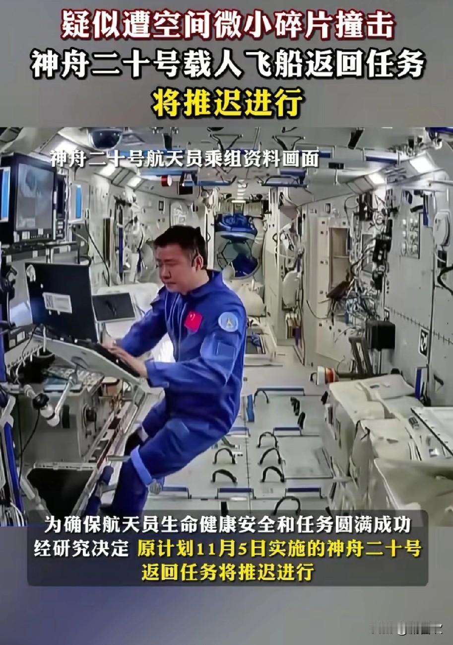 神舟二十号返回突发推迟! 刚刷到神舟二十号推迟返回的消息, 心里咯噔一下,这可是 头一回遇到这种情况! 原计划今天回家的乘组, 因为返回舱被太空小碎片撞了, 为了安全只能暂缓返程。 但说真的,这事儿别看突发, 反而让人更安心。 要知道太空里1厘米以上的碎片就超百万个,还以7.9公里/秒的速度飞, 撞一下威力别提多大 。 咱们的监测系统能及时发现问题, 果断推迟返回, 这不正是航天安全体系靠谱的证明吗? 之前神二十乘组还出舱给空间站装过“防护铠甲”呢, 现在遇到情况不冒进, 把航天员安全放第一位, 这才是大国航天该有的稳重。 晚几天回家没关系, 平安归来才是最重要的。 你觉得这次应急处置是不是特别让人放心? 让我们一起为航天英雄们祈福!