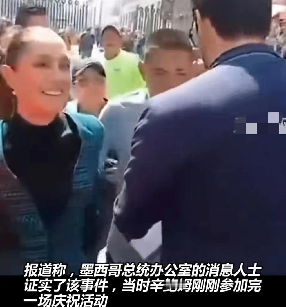11月4日,墨西哥首位女总统克劳迪娅•辛鲍姆结束庆祝活动后,现身墨西哥城国家宫附近。她微笑着和市民打招呼,并且和市民交谈。 一名疑似醉酒男子挤到总统身边,搂住她,吻了一下颈部。总统轻轻的推开了男子,拍了拍他的肩膀,似乎在告诉他,这样做,太无礼了。随后,安保人员将男子拦住了。 在西方文化中,亲吻颈部含有关系亲密,占有和保护的意思。男子的行为或许在表达你是亲爱的,我会支持你。但他太轻佻了。