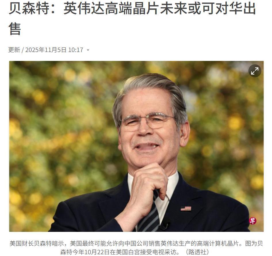 11月4日,美国财政部长贝森特在接受采访时竟然说,未来会允许英伟达向中国出口其生产的高端芯片!这里贝森特所说的高端芯片,是英伟达基于Blackwell架构设计的几款芯片,是当前英伟达的最先进芯片,他将其称之为“皇冠上的明珠”! 这个说法令人震惊。要知道在这之前,美国对英伟达芯片的出口,可是进行了高强度的管制,别说当前最先进的芯片了,甚至就连落后了好几代的次等芯片,都不允许其出口到中国,可现在,却是直接口风大变,说未来有可能允许英伟达出口这些高端芯片。 之所以如此,估计还是因为现在美国真的着急了。虽然美国之前对英伟达等芯片企业进行了高强度的管控,但是这不仅没有影响我们国家人工智能行业的发展,而且还让我们自己的芯片产业也有了一个大爆发,几乎开始与美国分庭抗礼。 最典型的例子就是在成熟制程芯片领域,我们的产量飞速提升,性价比又极高,以至于都开始反向出口到美国台湾日本等地方。 美国对芯片行业进行出口管制,其目的是为了阻碍我们的发展,可结果却完全相反,他们如何能不着急? 实际上,之前英伟达的老板黄仁勋,就曾多次发出过警告,说美国这个管制芯片出口的行为,根本没啥效果,不仅没有效果,反而对美国自身有巨大损害,比如英伟达在中国的市场份额,现在就从之前的95%降低到了0。 现在看来,黄仁勋的警告,以及这个冷冰冰的现实,应该是让美国的领导层真正清醒了,着急了,现在态度观点都开始发生改变。 只不过,即便现在贝森特等人,决定要放开管制,估计也晚了。我们经过这些年的发展,已经有了深厚的技术积累,对美国的芯片早就已经没有那么大的依赖了,就算是他们允许芯片出口到我们这里,又能改变什么?我们依旧会在这一条芯片行业的独立自主之路,昂首挺胸大踏步前行。 等到了最后,就是凭借我们自家这个“工业克苏鲁”的力量,通过纯粹的市场竞争,让台积电、英伟达等企业,也都黯然跌落神坛!
