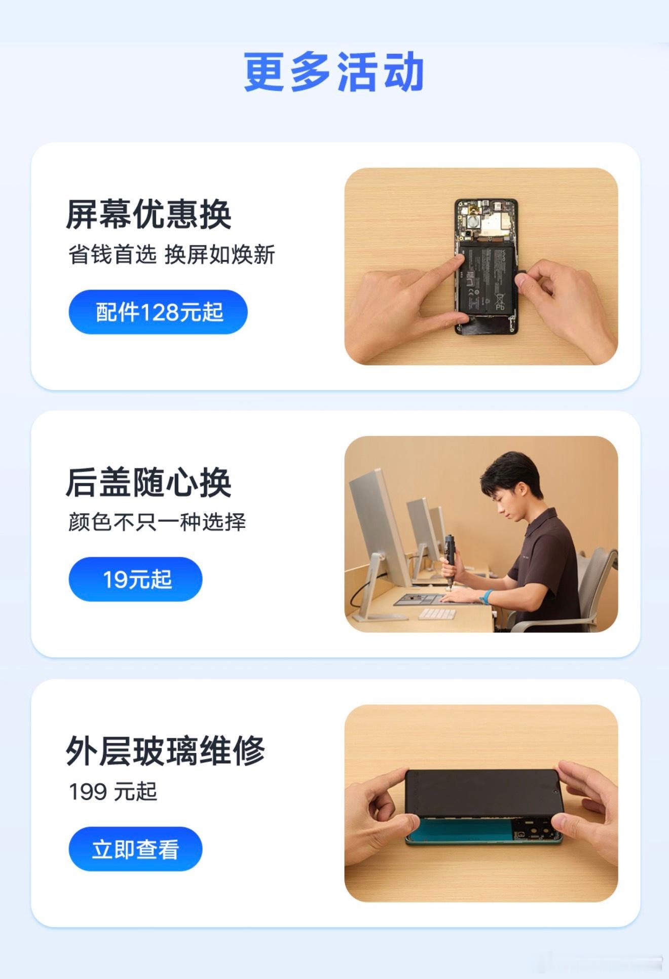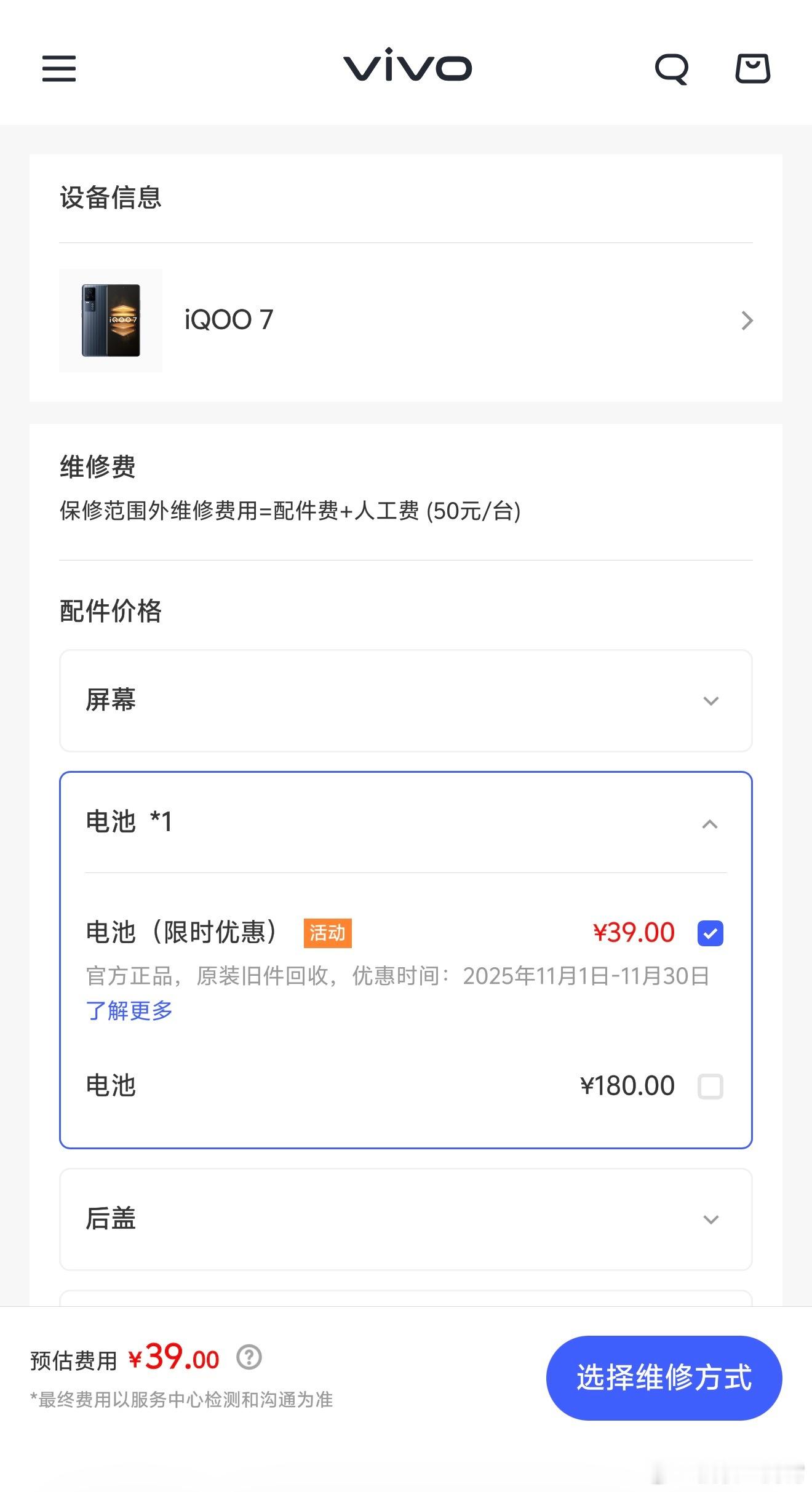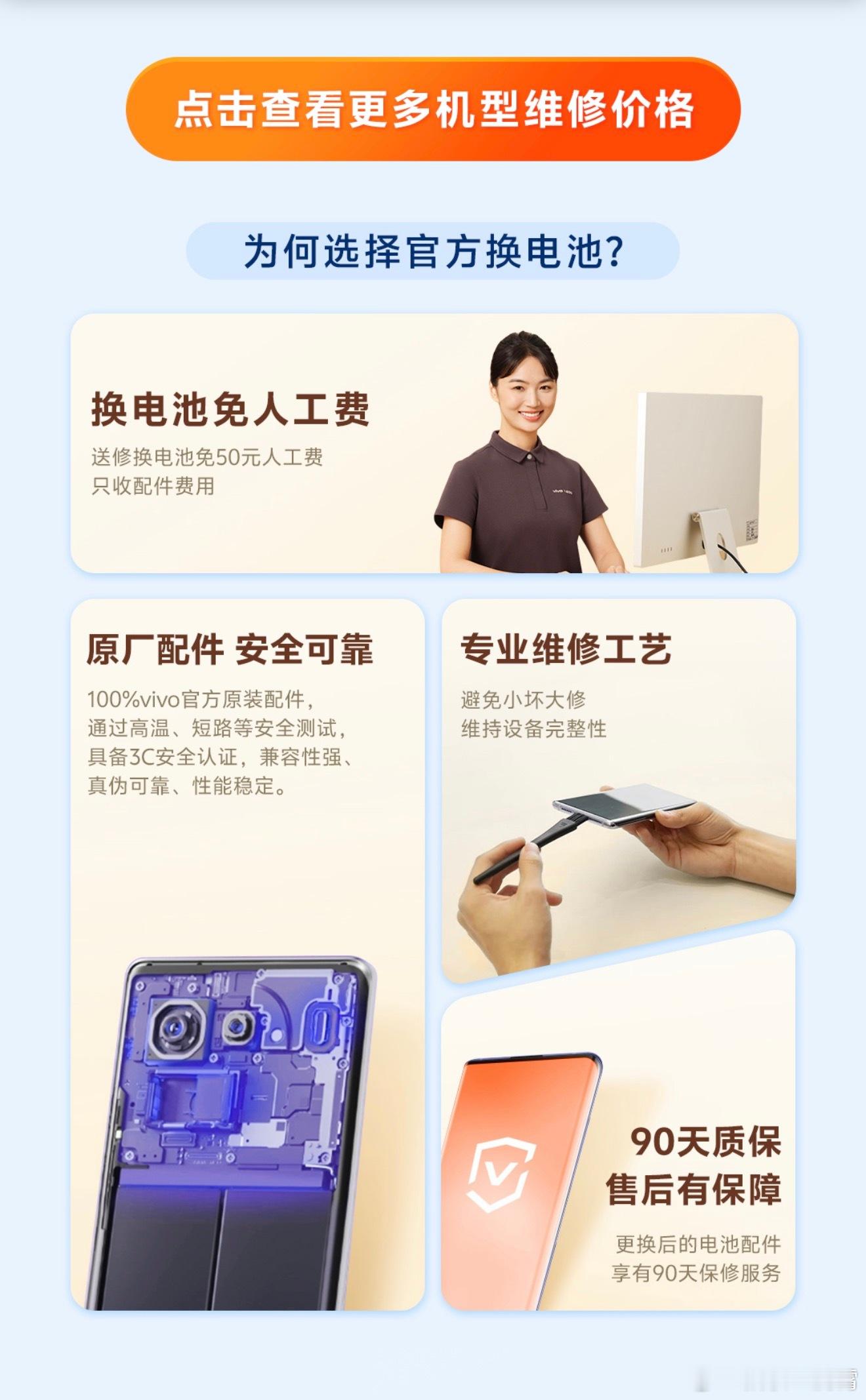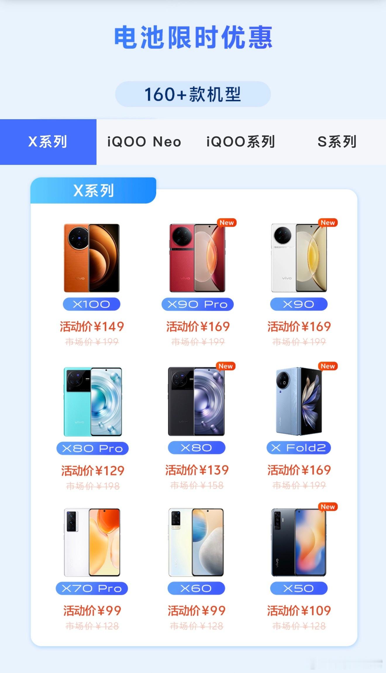 话说蓝厂搞的这个电池换新活动可以啊,替大家看了下对老用户相当友好,最便宜39就可以给老机型换电池,还不用再出人工费,包括说换屏幕或换后盖啥的都挺便宜,可以吧[笑而不语]