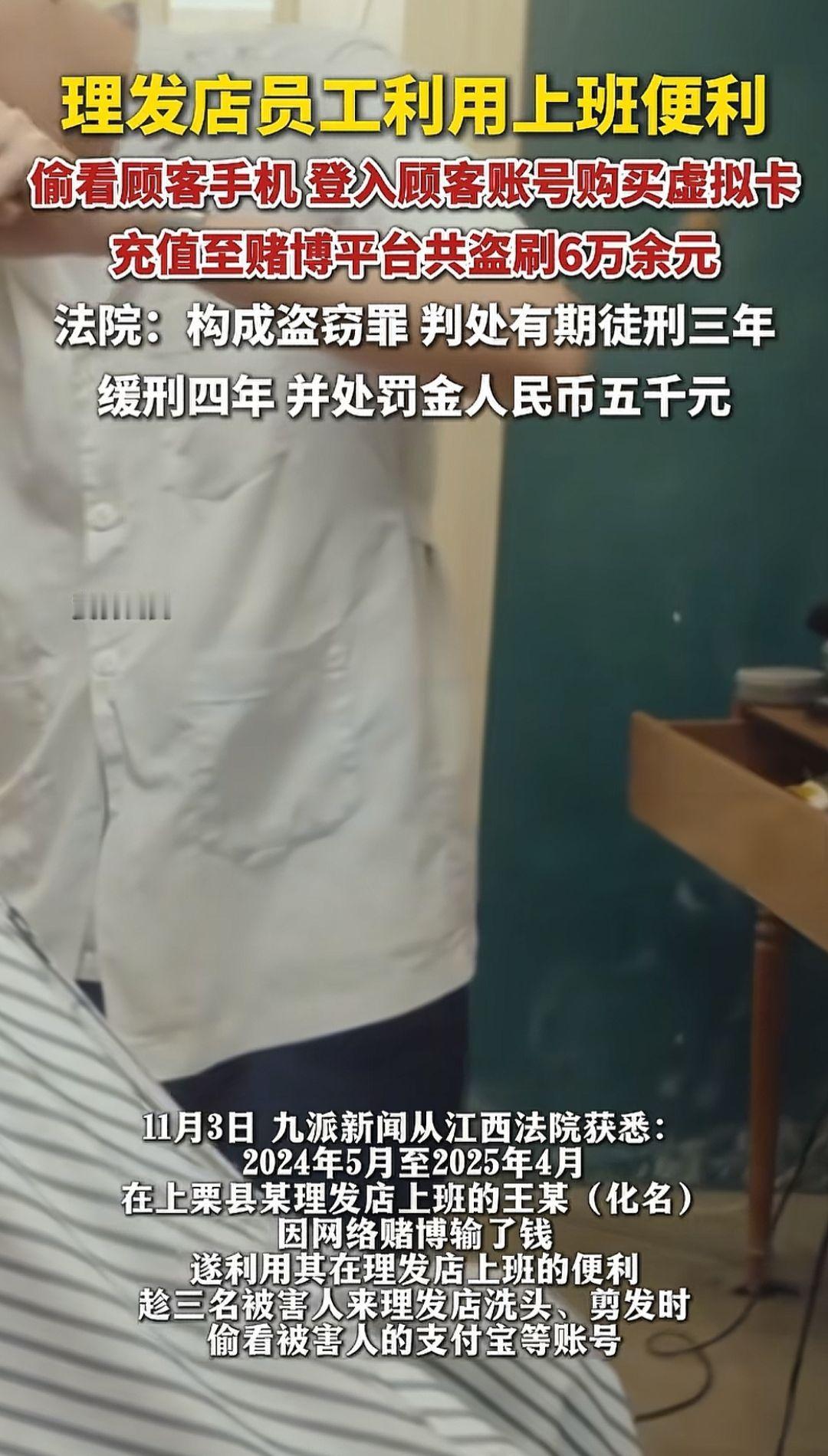 11月4日,理发店员工偷看顾客手机盗刷6万余元,被判缓刑并处罚。