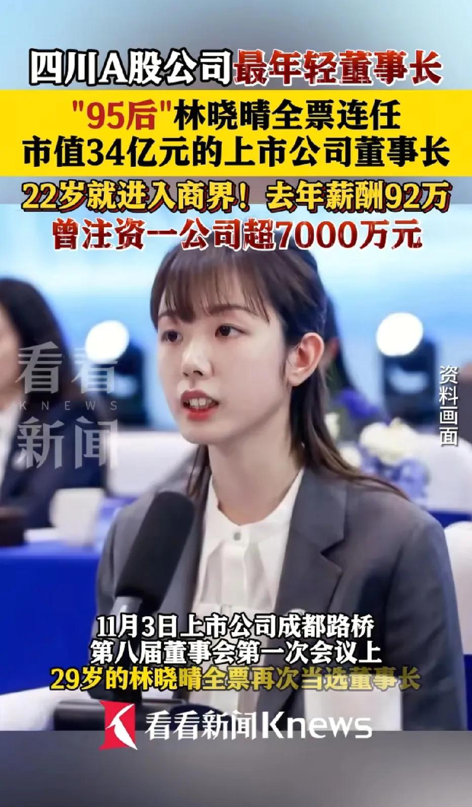 哎,看看人家的95后,这个履历有多强!“95”后小姑娘已经是四川A股公司的董事长!而且是连任的喔!全票通过!人家22岁的时候就已经进入了商界,想想自己22岁的时候,还在念书,人家就已经进入商界“闯荡”了!真牛! 据了解,她去年的年薪就已经高达九十二万多,真的是年轻有为又多金![捂脸]关键还长得很有气质,很漂亮,简直是人生赢家了! 想知道她是怎么坐到这个位置的,一定有过人之处,有才华有担当[赞],大家说对吧?