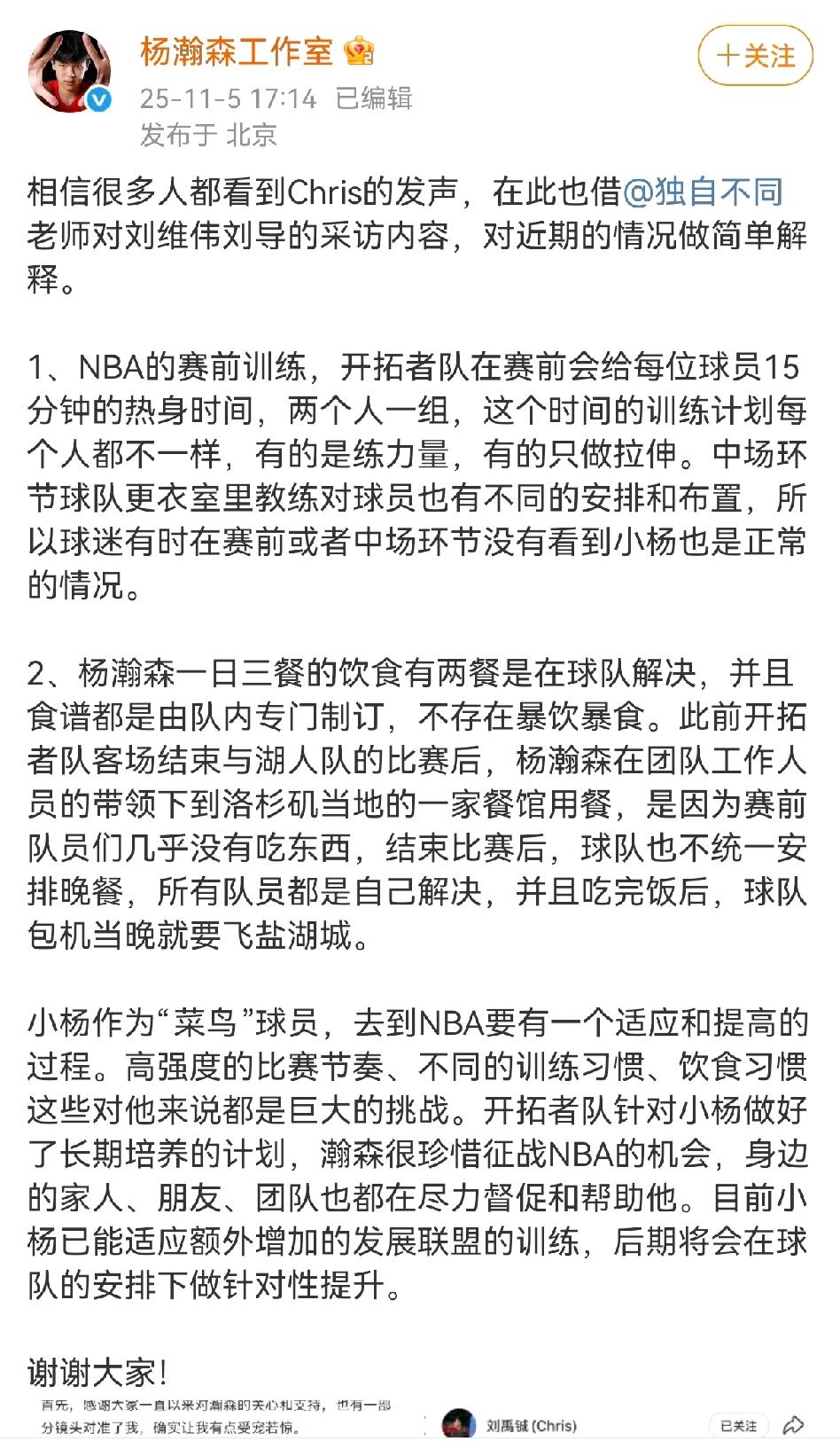杨瀚森翻译的发文更显示出高材生的智商确实厉害! 杨瀚森女友发文和女友闺蜜发文,包括工作室发文都引起球迷不满,觉得他们不会讲话更不懂的舆论把握,但是杨瀚森的翻译一发文大家都直夸不愧是高材生。 翻译的文风用词非常严谨,态度也非常谦逊抱着学习的态度和大家交流,把自己置于低位帮助杨瀚森说话扭转舆论。 大家说翻译一说话又把小杨比下去了,让翻译多带着小杨自律学习。