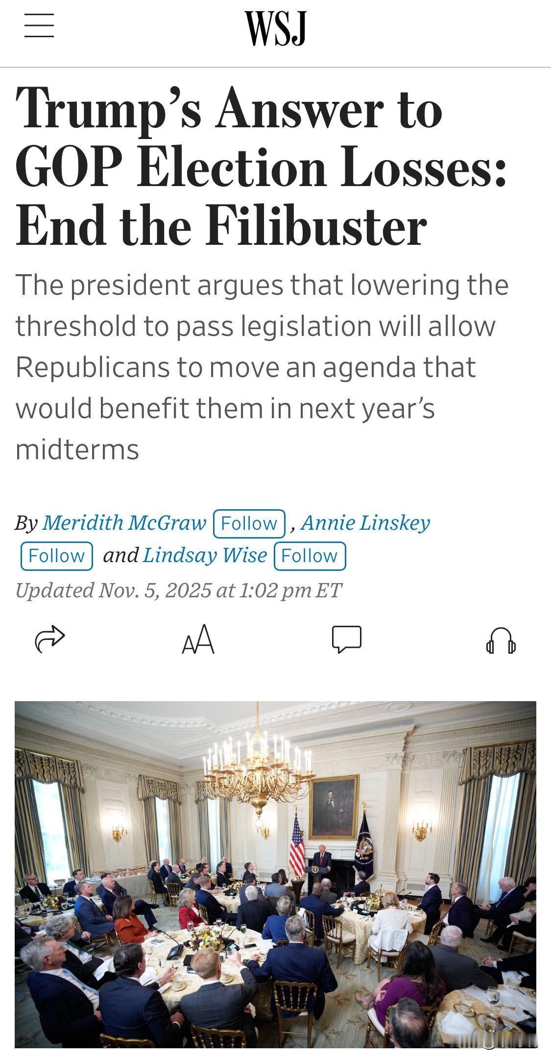 川普和共和党人开始反思此次败选。 2025 年 11 月 5 日,唐纳德·特朗普总统在白宫国宴厅与共和党参议员举行早餐聚会并发表讲话。 川普说:“如果你看看民调机构的调查结果,就会发现四场选举的输,政府停摆是一个重要因素——对共和党来说是负面的。” 川普说,民主党在玩政治黑手方面,高出共和党人不止一个档次,他们早就开始密谋为11月的选举作铺垫了,其中最重要的一个就是从10月1日起,提出让共和党不可能同意的条款(比如继续给非法移民提供免费医保等),来让联邦政府停摆。 本次政府停摆已持续5周,成为美国历史上最长的一次政府关闭。由于国会未能通过预算拨款法案,超过80万名联邦雇员被迫休假或无薪工作,国家公园关闭,机场安检延误,社会服务陷入瘫痪。 共和党内部原本认为,这一停摆是迫使民主党妥协、削减财政开支的政治工具,但事实证明适得其反。 另外早餐会上大家认为川普政府过于关注国际事务例如俄乌战争等而忽视了国内事务。 输掉蓝州几场选举并不可怕。可怕的是不警醒不反思。 在民主党的基本盘无比稳固的情况下,共和党必须团结一致,必须重视基层,必须把主要精力移到国内事务,必须真正做到美国优先。 明年的中期选举不能再输了。