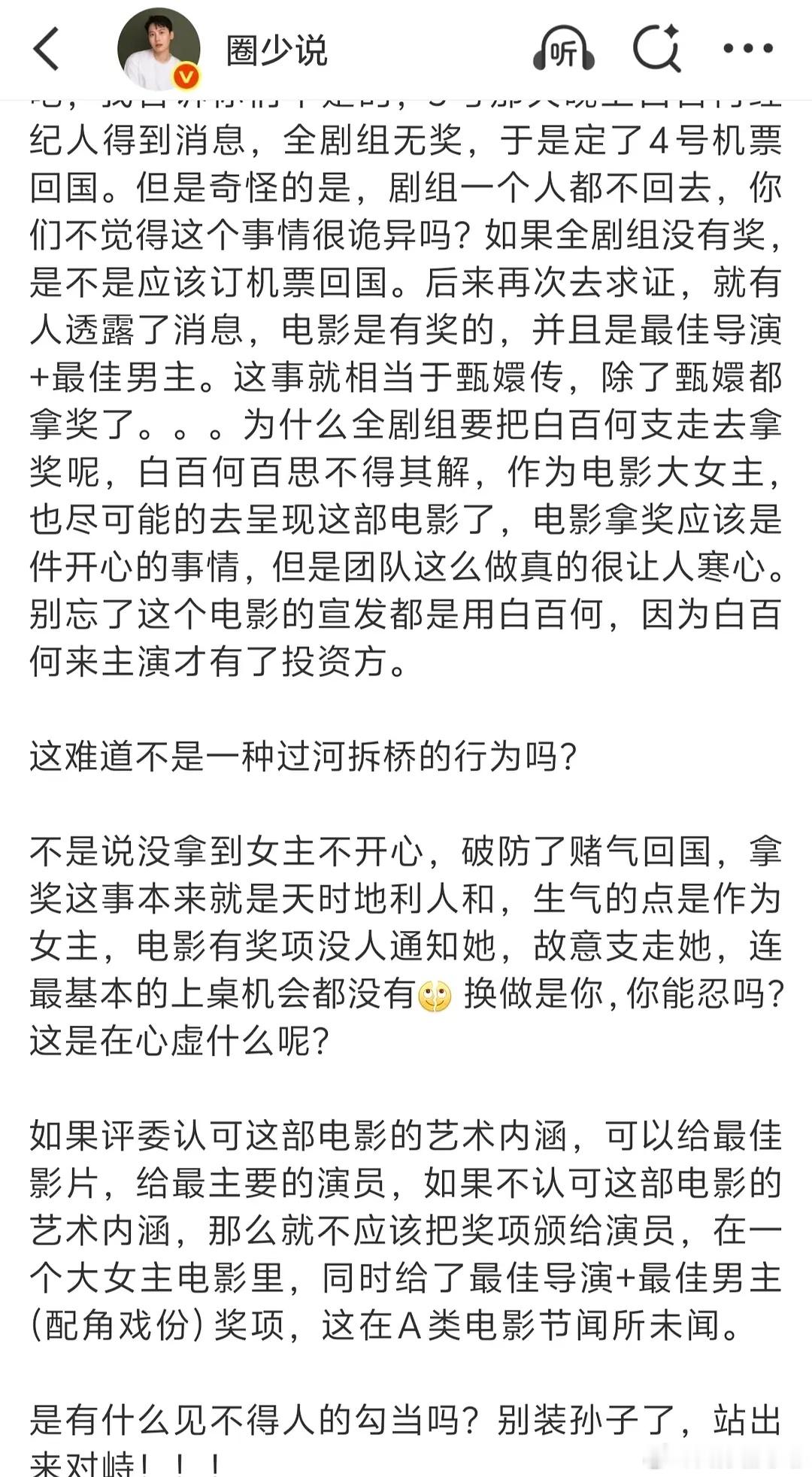 有人爆料了白百何相关始末,疑似是剧组一开始瞒着女主角留下来拿奖,所以不高兴了发了那条