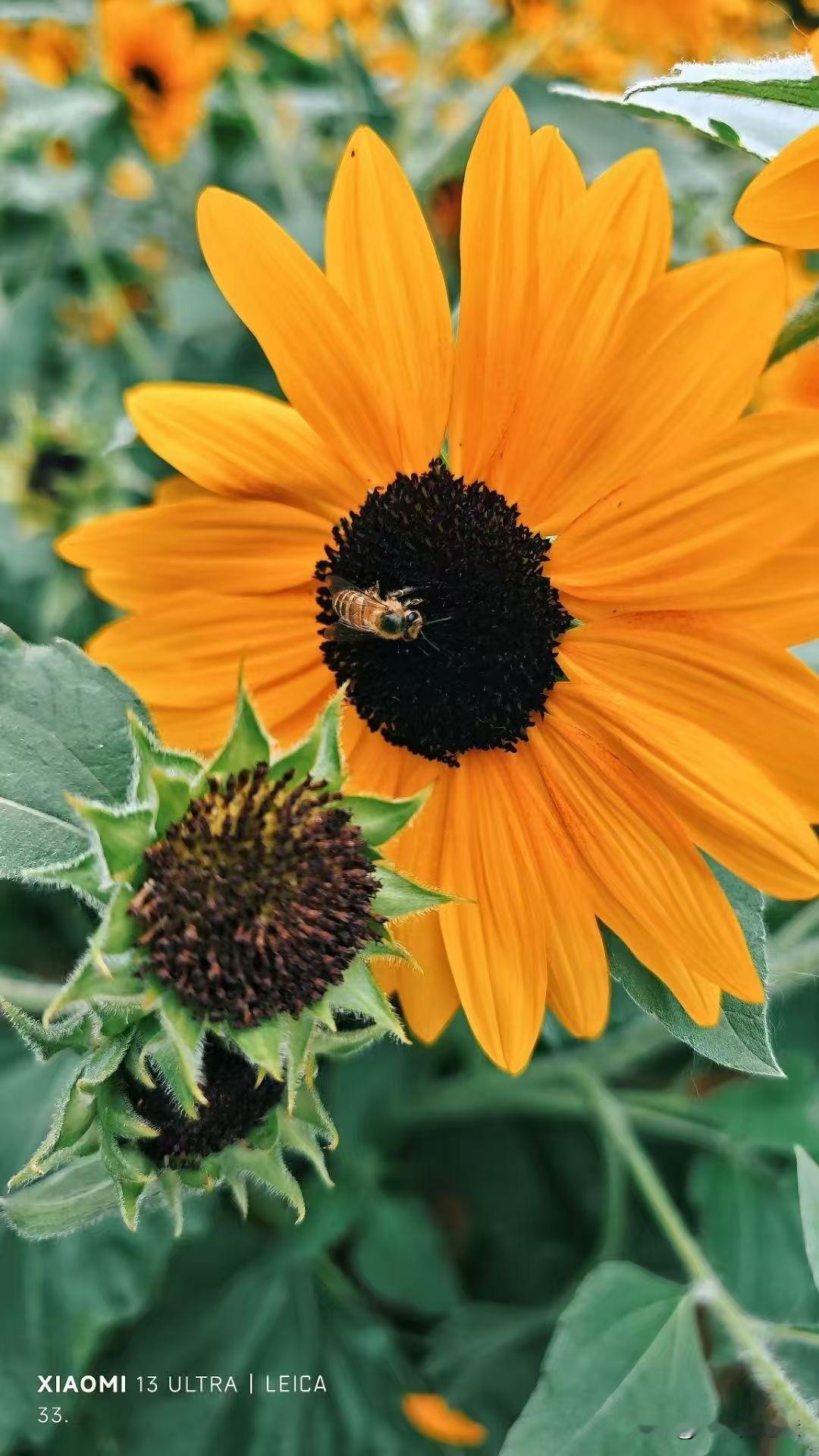 今天在郊外撞见这片向日葵田,眼睛都亮了!蹲下来看这朵开得最旺的,黄花瓣像被太阳烤得发亮,黑糊糊的花盘上还扒着只蜜蜂——你看它那小绒毛都沾着花粉,正“嗡嗡”地埋着头猛炫蜜,连我凑这么近都不带抬下脑袋的。 旁边那朵还是花苞,裹得紧紧的像个小毛球,跟旁边这朵舒展的大花比,倒像个怯生生的小不点。风一吹,花瓣晃得软乎乎的,连带着空气里都飘着点清清爽爽的甜香。 掏出手机咔嚓两下,这画面跟夏天的劲儿一模一样,热热闹闹的,看得人心里都敞亮了。