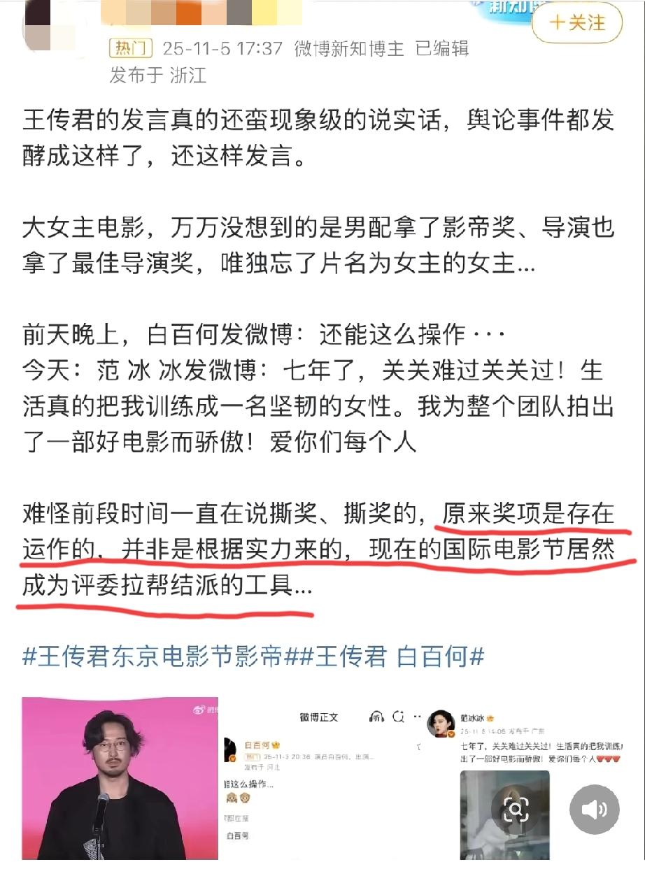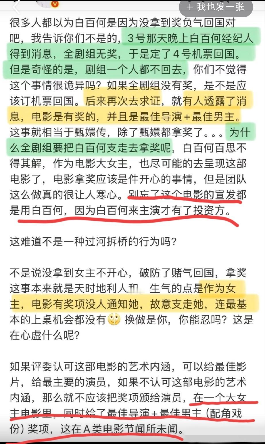 白百何没获奖,王传君获奖了,白百何随后发博疑是内涵王传君,王传君发表获奖感言时却感谢了白百何。这个事情看似白百何小肚鸡肠、王传君胸怀宽广,背后其实却另有隐情! 据知情者透露:是白百何经纪人被告知全组都没有获奖,她才订机票回国,可剧组其他成员没有一个回国的,显然是知道导演和王传君是有获奖的。这样做对白百何这位大女主显然是不合适的,而且这部电影是因为有白百何才拉来了投资。 有网友表示:原来奖项是存在运作的,并非是根据实力来的! 各位看官大爷,这个事情上你们是什么看法?
