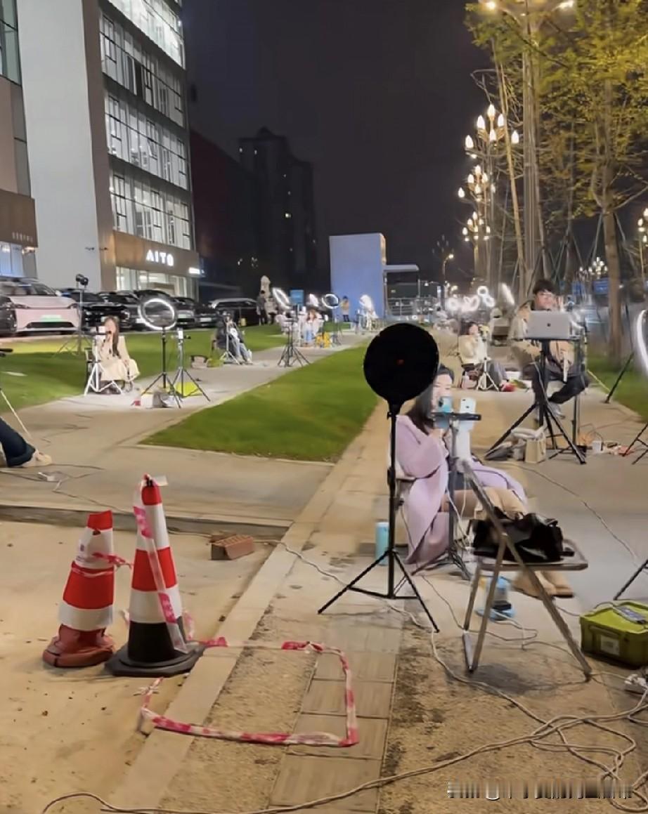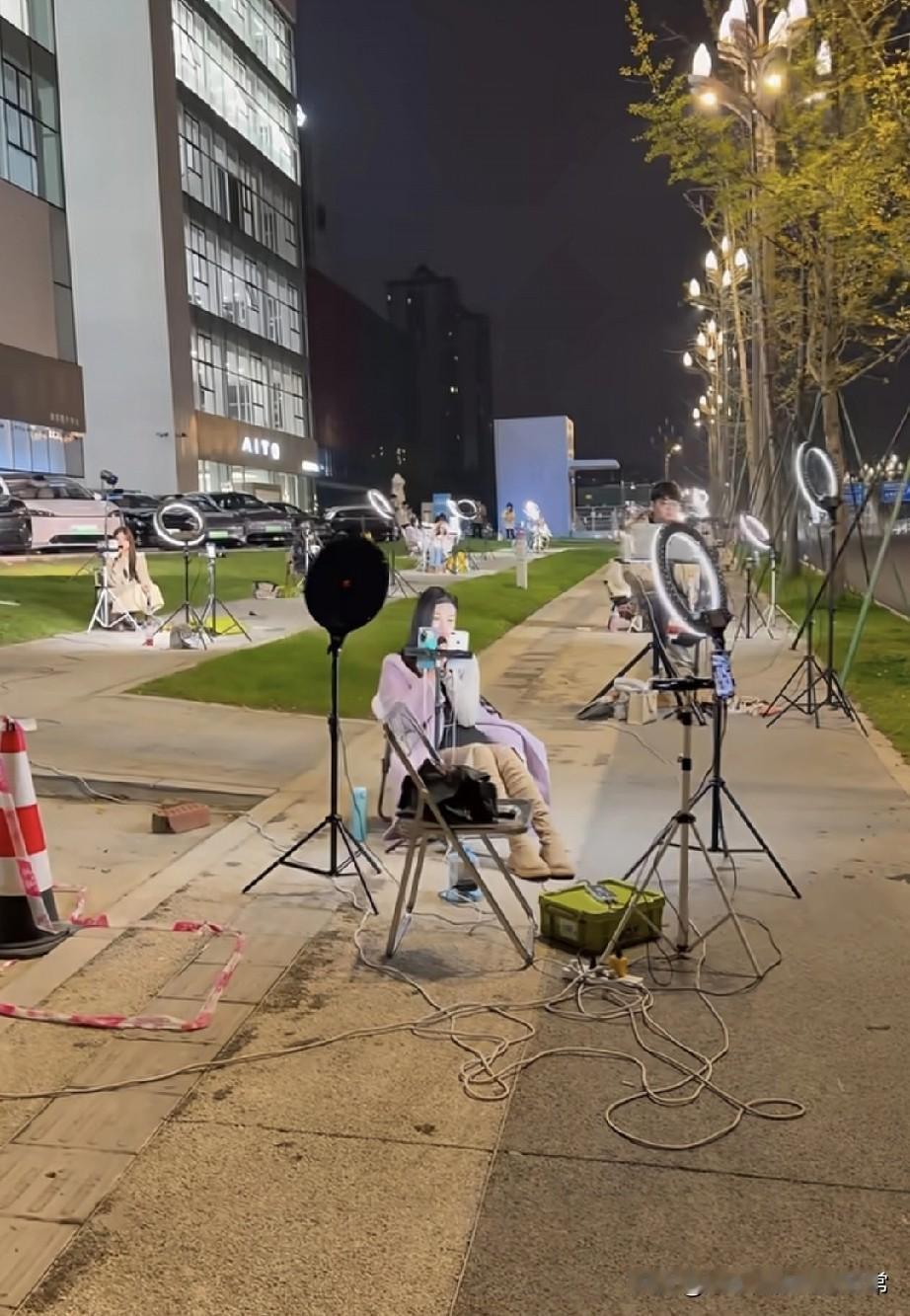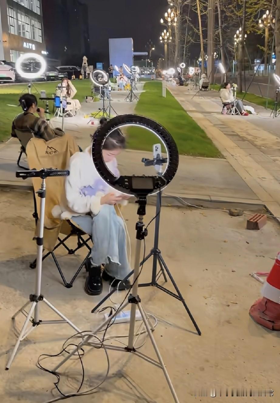 凌晨的马路,一排美女举着补光灯,美女到底在卷什么 刚下楼买烟,直接看傻了——凌晨的市政步道上,一排姑娘支着环形补光灯、架着手机,裹着毛毯坐小马扎上对着镜头“营业”,有的念稿子,有的摆姿势,电线缠得像蜘蛛网,连路都快堵了。 这是把“直播间”搬大马路上了?前阵子刷到有人蹲菜市场直播,现在直接卷到凌晨户外?合着咱睡大觉的时候,别人已经在抢流量了? 别说“不用睡觉”,看那黑眼圈配着补光灯的冷白光,活像一群“赛博夜猫子”。有个姑娘裹着羽绒服还在擦鼻涕,旁边的姐妹举着支架连打哈欠——这哪是直播,这是拿命换曝光啊! 咱就说,现在想赚点钱,真得把24小时拆成48小时用?白天卷工位,晚上卷直播,这“生存KPI”是要把人焊在互联网上吗? 你们说,这到底是“搞钱刚需”,还是“流量魔怔”了?