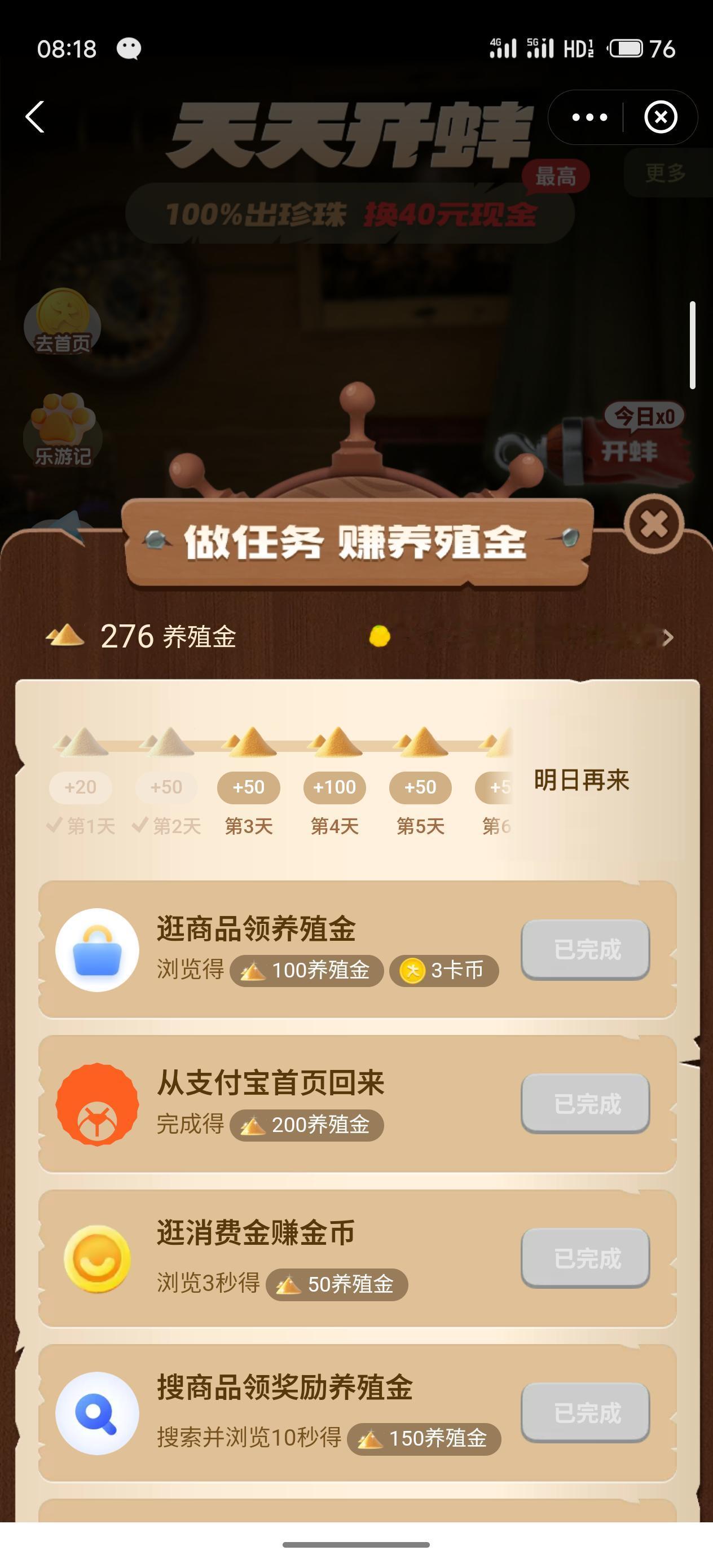 昨天第一天玩天天开蚌 有点意思 zfb直接搜索乐动力 里面就有天天开蚌 推荐你再下载一个乐动力APP 你会发觉,两者里面的小任务略有区别,都可以去做 总共大约十来分钟就可以做完 不能卖钱的直接换成养殖金再投入生产 支付宝天天开蚌 支付宝 免费薅羊毛