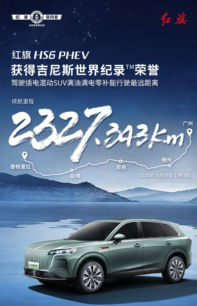 中国混动破世界纪录红旗HS6 PHEV直接拿下吉尼斯世界纪录,成为全球“插混SUV满油满电不补能跑最远”的车型。