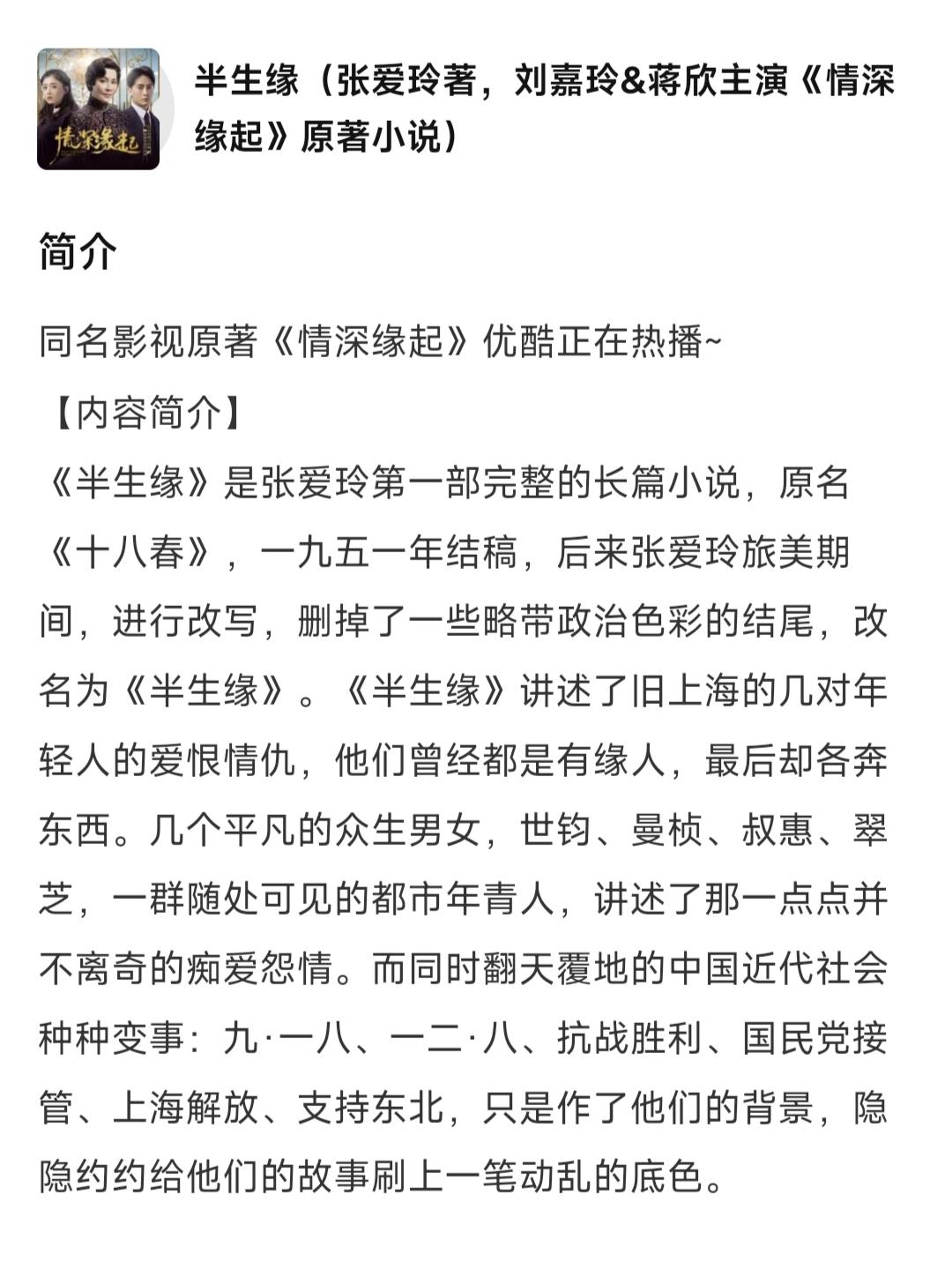 📖《半生缘》里的遗憾,读一次痛一次。旧上海的霓虹下,世钧与曼桢的初见带着青涩,叔惠和翠芝的交集藏着试探。他们是最寻常的都市男女,憧憬过安稳,却被命运推着各奔东西。 曼桢抽屉里那只没送出的手套,世钧多年后翻开的旧信,藏着多少欲言又止的爱意?动荡年代像层磨砂玻璃,模糊了重逢的路——炮声、硝烟、时代更迭的洪流,悄悄改写了所有人的轨迹。没有惊天动地的狗血,只有“我们回不去了”的怅然。关于旧上海爱情,半生缘浅,却在心底刻了一辈子。 小说 剧情 电视剧 好剧推荐