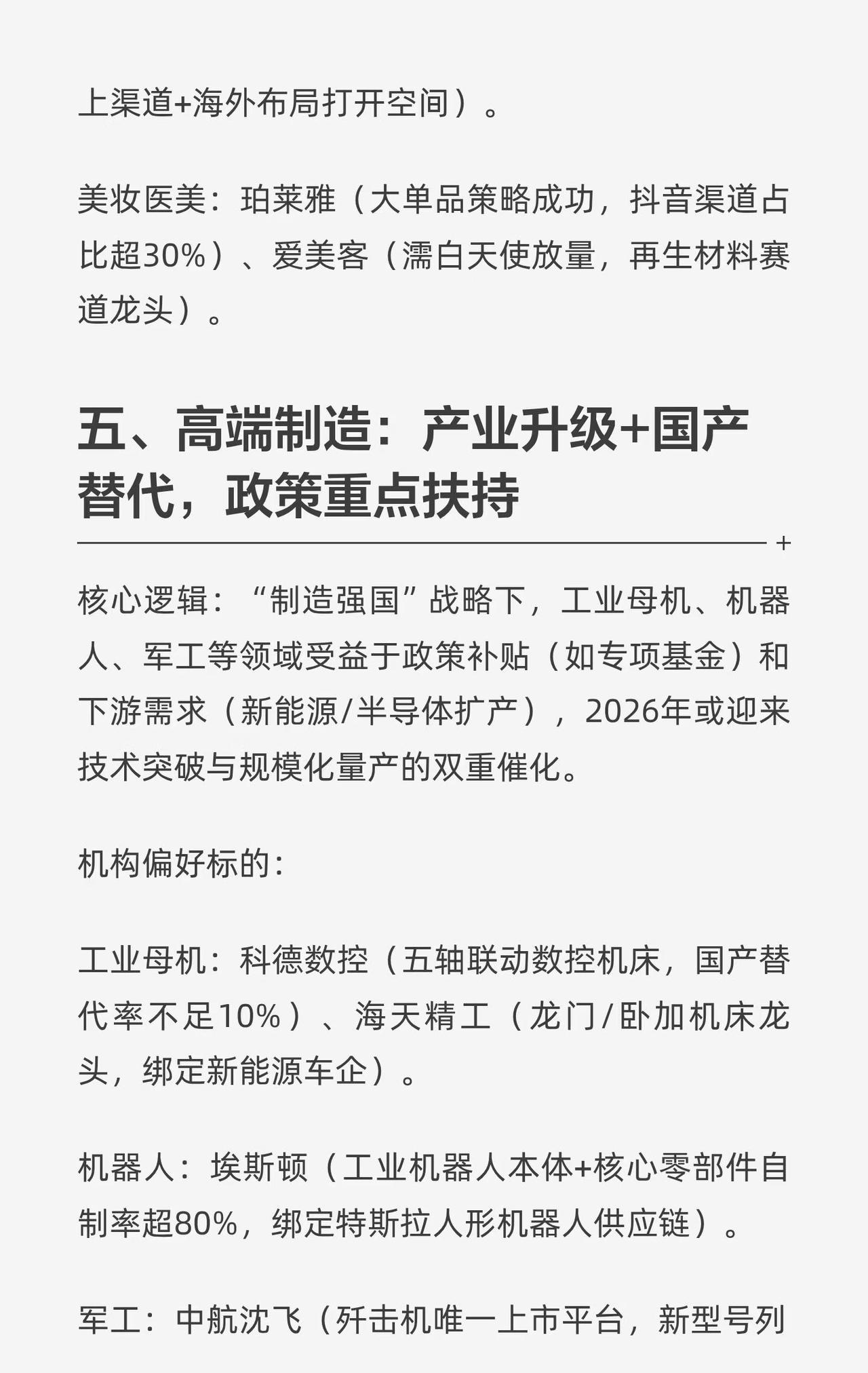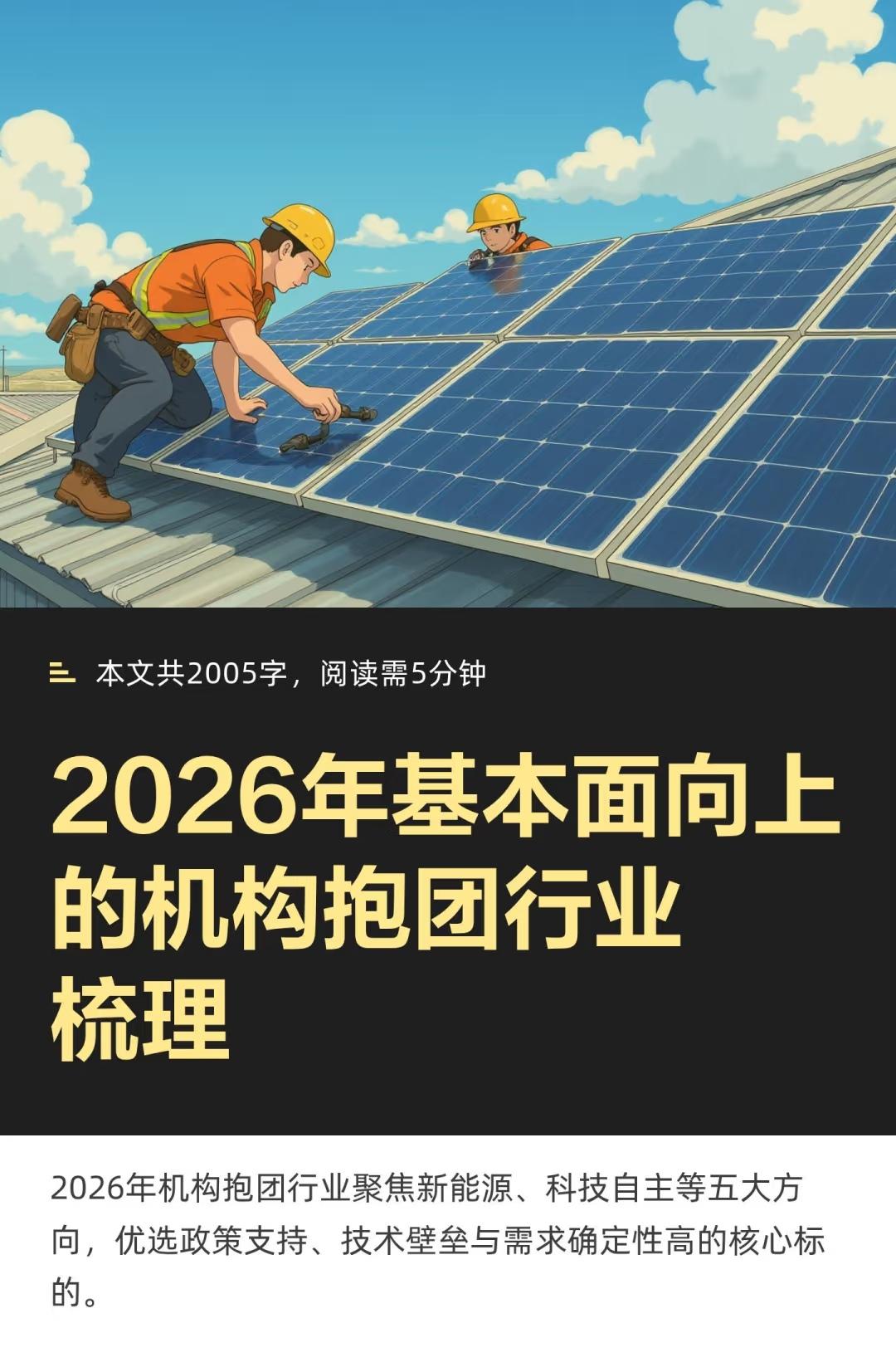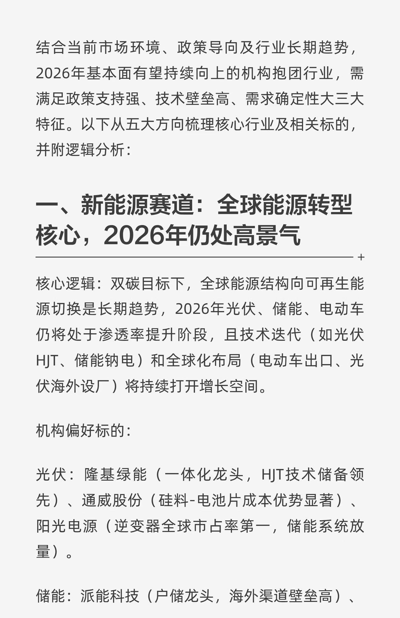 2026年基本面向上的机构抱团行业的全面梳理与总结,涵盖五大核心方向及其代表企业,以及相应的投资逻辑与策略建议: 一、新能源赛道:全球能源转型的核心引擎,2026年维持高景气 核心逻辑: 在“双碳”目标引领下,全球能源结构向可再生能源转型是大势所趋。2026年,光伏、储能、电动车行业仍将处于快速渗透阶段,叠加技术迭代(如光伏HJT技术、储能钠离子电池)和全球化布局(如电动车出口、光伏企业海外设厂),行业增长空间广阔。 机构偏好标的: - 光伏: - 隆基绿能:一体化龙头,HJT技术储备领先; - 通威股份:硅料-电池片环节成本优势显著; - 阳光电源:逆变器全球市占率第一,储能系统业务快速放量。 - 储能: - 派能科技:户储领域龙头,海外渠道壁垒高。 - 电动车及产业链: - 宁德时代:全球动力电池龙头,海外车企定点加速; - 亿纬锂能:采用圆柱电池+大软包双线布局,绑定特斯拉、现代等客户; - 南网科技:电网侧储能集成商,受益于国内大储需求爆发。 二、科技自主:国产替代与AI革命下的硬科技避险选择 核心逻辑: 中美科技竞争常态化,半导体、AI、信创等关键领域国产替代紧迫性日益增强。同时,AI算力需求爆发(如GPU/DPU/存储)和生成式AI应用(办公、教育、医疗等)推动科技股业绩与估值双升。2026年,这些领域有望迎来技术突破与市场扩容的共振。 机构偏好标的: - 半导体设备/材料: - 中微公司:刻蚀机全球前五,实现5nm制程突破; - 北方华创:平台型设备商,覆盖刻蚀、沉积、清洗等关键环节; - 安集科技:CMP抛光液国产替代率超30%。 - AI算力: - 海光信息:x86架构服务器CPU/GPU,绑定运营商与互联网大厂; - 寒武纪:云端训练芯片,大模型厂商采购量持续增长。 - 信创软件: - 金山办公:WPS国产替代主力,党政/金融客户覆盖率超80%; - 中国软件:麒麟OS操作系统,成为信创PC/服务器标配。 三、医药生物:老龄化刚需 + 创新驱动,长坡厚雪赛道 核心逻辑: 中国60岁以上人口占比已超20%,慢性病管理、肿瘤治疗、高端医疗器械需求持续增长。医保控费背景下,创新药(差异化靶点)、高端器械(进口替代)、医疗服务(连锁化扩张)成为机构规避政策风险的核心方向。2026年,老龄化加速将进一步释放行业需求。 机构偏好标的: - 创新药: - 恒瑞医药:PD-1海外申报推进,ADC管线进入收获期; - 百济神州:BTK抑制剂全球销售峰值预计超100亿美元。 - 医疗器械与医疗服务: - 迈瑞医疗:监护仪、呼吸机全球前三,内镜/超声高端产品不断突破; - 联影医疗:MRI/CT国产替代率提升,海外收入占比超30%; - 爱尔眼科:近视防控与老花眼手术需求增长,并购基金扩张模式成熟; - 通策医疗:区域口腔龙头,通过“蒲公英计划”加速下沉县级市场。 - 消费升级(医药相关): - 美妆医美: 如珀莱雅(大单品策略成功,抖音渠道占比超30%)、爱美客(濡白天使放量,再生材料赛道龙头)。 四、消费升级:品牌壁垒 + 复苏弹性,机构“压舱石”配置 核心逻辑: 经济温和复苏背景下,居民收入预期改善,高端消费(抗周期)与新消费(高增长)兼具确定性。白酒、免税等赛道因品牌护城河深、提价能力强,成为机构长期持有的“压舱石”。 机构偏好标的: - 高端白酒: - 贵州茅台:供需缺口持续,直销占比提升至45%; - 五粮液:千元价格带龙头,经典五粮液培育第二增长曲线。 - 免税: - 中国中免:海南离岛免税市占率超80%,线上线下渠道布局完善。 - 美妆医美: - 珀莱雅:大单品策略成功,抖音等新兴渠道表现突出; - 爱美客:濡白天使产品放量,再生材料赛道领先。 五、高端制造:产业升级 + 国产替代,政策重点扶持 核心逻辑: 在“制造强国”战略驱动下,工业母机、机器人、军工等高端制造领域受益于政策补贴(如专项基金)和下游需求(新能源/半导体扩产)。2026年,这些领域有望迎来技术突破与规模化量产的双重催化。 机构偏好标的: - 工业母机: - 科德数控:五轴联动数控机床,国产替代率不足10%,具备巨大提升空间; - 海天精工:龙门/卧加机床龙头,绑定新能源车企。 - 机器人: - 埃斯顿:工业机器人本体+核心零部件自制率超80%,绑定特斯拉人形机器人供应链。 - 军工: - 中航沈飞:歼击机唯一上市平台,新型号列装加速; - 航发动力:航空发动机总装企业,为国产大飞机C919提供配套。