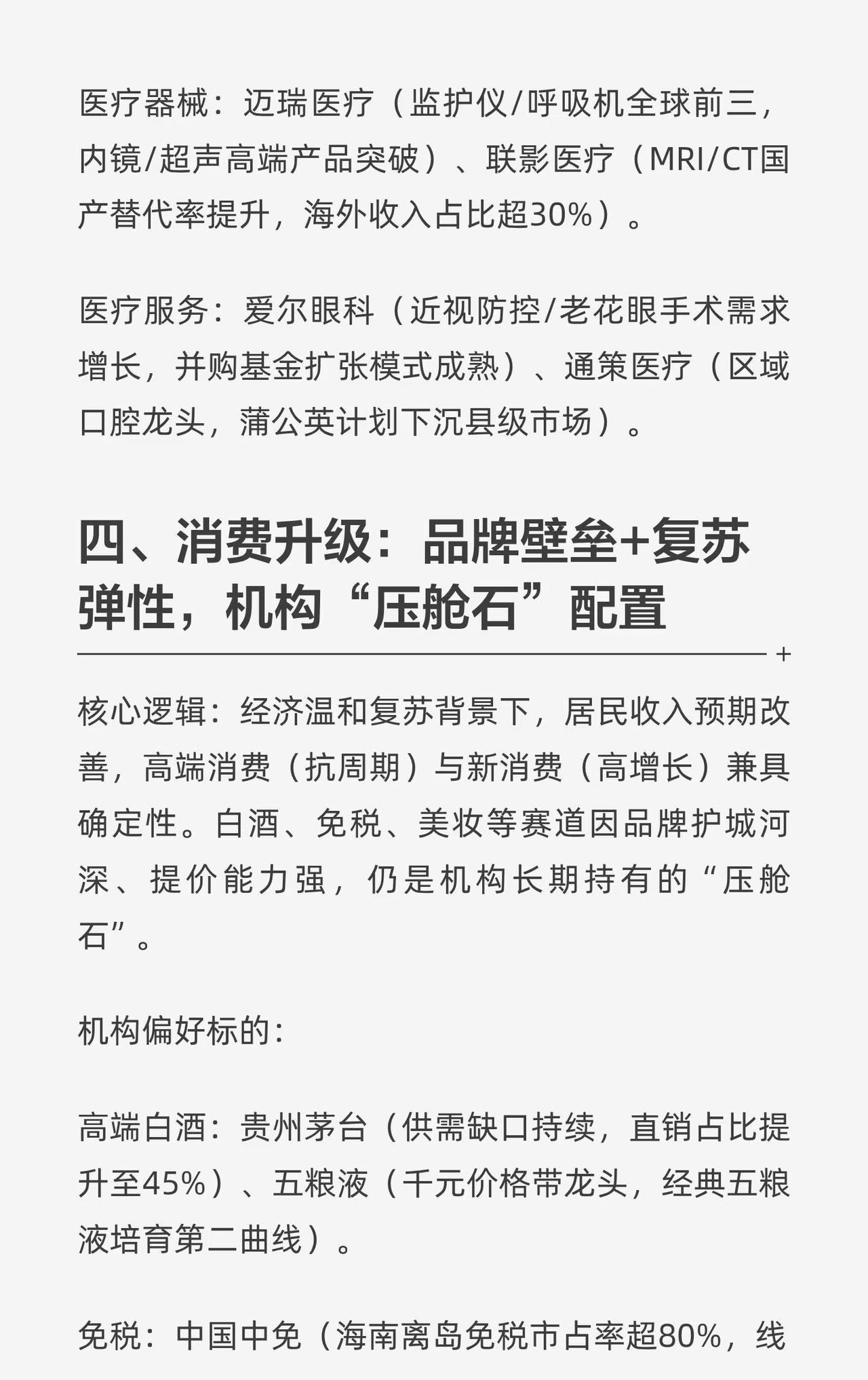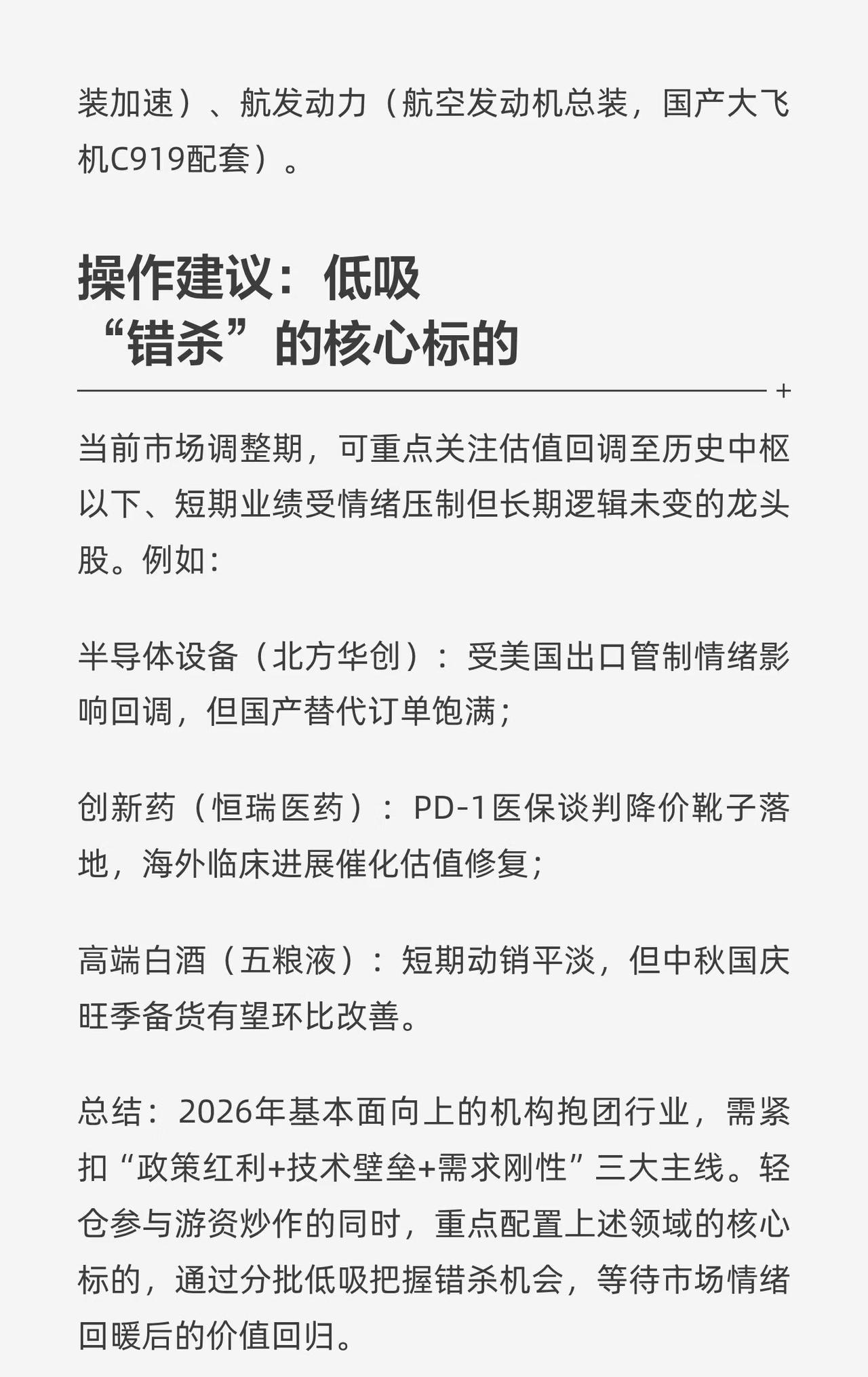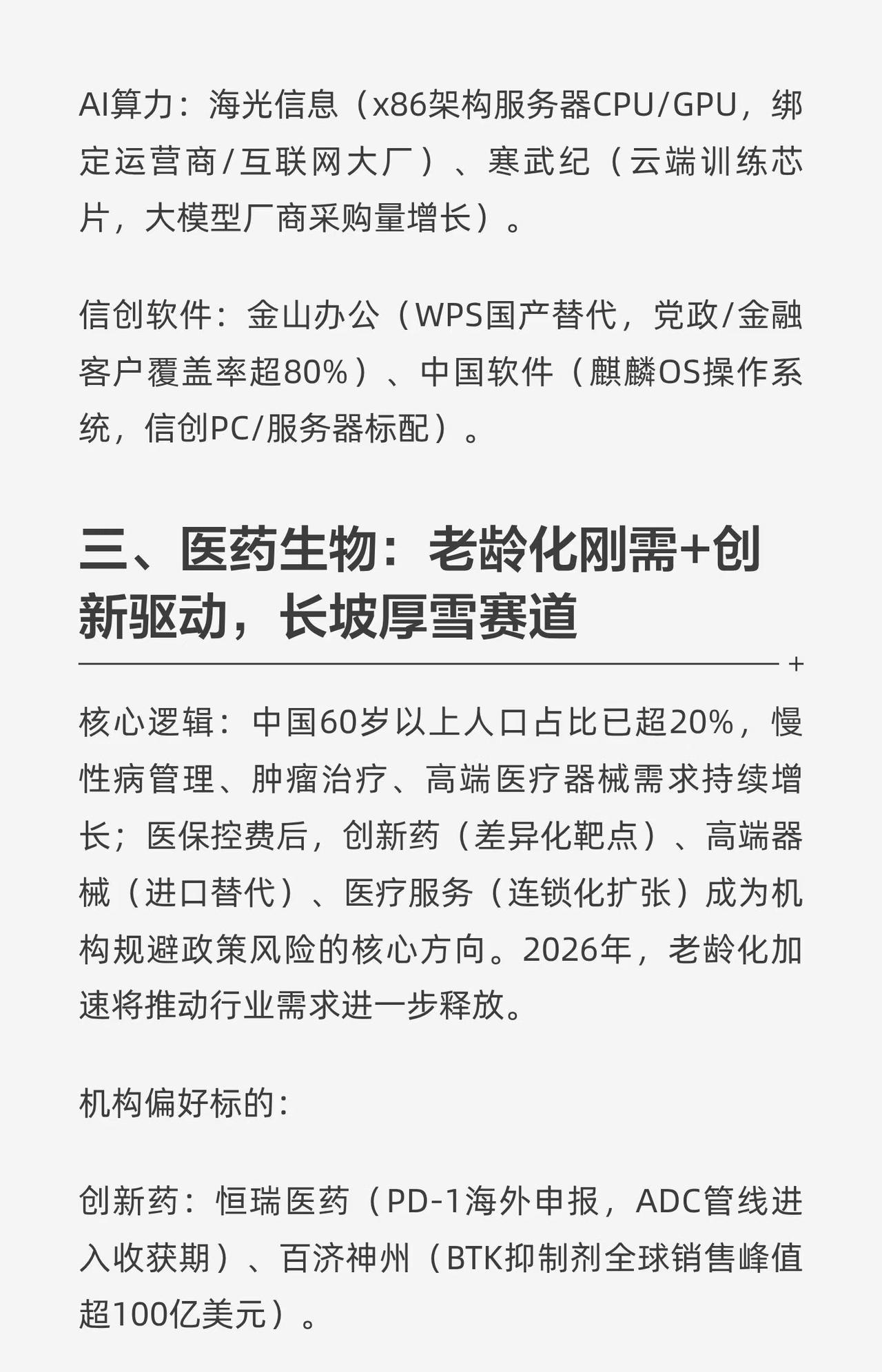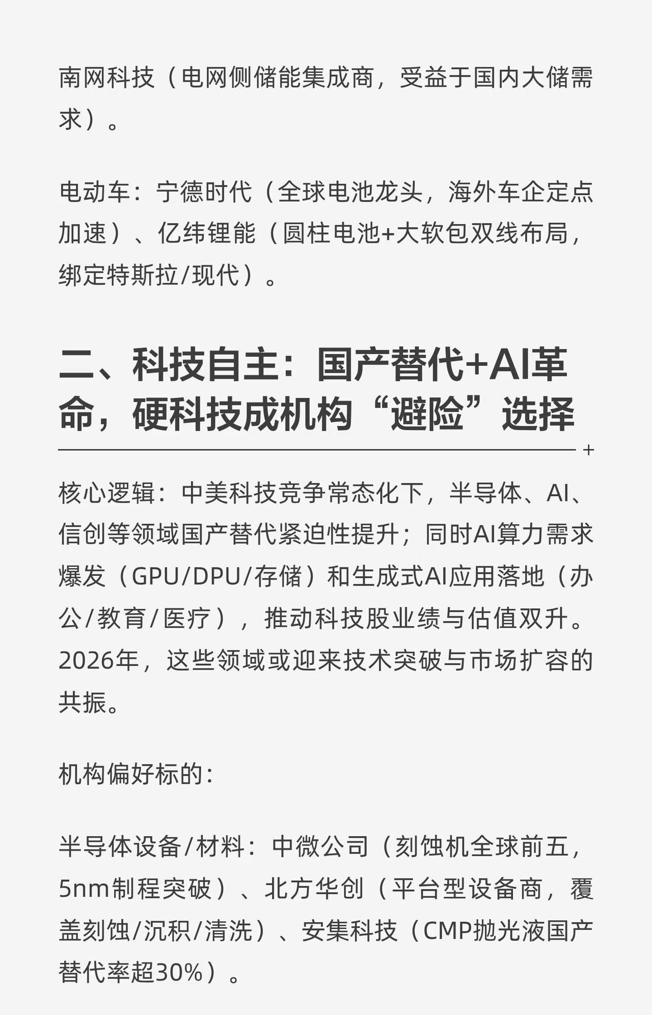 2026年基本面向上的机构抱团行业的全面梳理与总结,涵盖五大核心方向及其代表企业,以及相应的投资逻辑与策略建议: 一、新能源赛道:全球能源转型的核心引擎,2026年维持高景气 核心逻辑: 在“双碳”目标引领下,全球能源结构向可再生能源转型是大势所趋。2026年,光伏、储能、电动车行业仍将处于快速渗透阶段,叠加技术迭代(如光伏HJT技术、储能钠离子电池)和全球化布局(如电动车出口、光伏企业海外设厂),行业增长空间广阔。 机构偏好标的: - 光伏: - 隆基绿能:一体化龙头,HJT技术储备领先; - 通威股份:硅料-电池片环节成本优势显著; - 阳光电源:逆变器全球市占率第一,储能系统业务快速放量。 - 储能: - 派能科技:户储领域龙头,海外渠道壁垒高。 - 电动车及产业链: - 宁德时代:全球动力电池龙头,海外车企定点加速; - 亿纬锂能:采用圆柱电池+大软包双线布局,绑定特斯拉、现代等客户; - 南网科技:电网侧储能集成商,受益于国内大储需求爆发。 二、科技自主:国产替代与AI革命下的硬科技避险选择 核心逻辑: 中美科技竞争常态化,半导体、AI、信创等关键领域国产替代紧迫性日益增强。同时,AI算力需求爆发(如GPU/DPU/存储)和生成式AI应用(办公、教育、医疗等)推动科技股业绩与估值双升。2026年,这些领域有望迎来技术突破与市场扩容的共振。 机构偏好标的: - 半导体设备/材料: - 中微公司:刻蚀机全球前五,实现5nm制程突破; - 北方华创:平台型设备商,覆盖刻蚀、沉积、清洗等关键环节; - 安集科技:CMP抛光液国产替代率超30%。 - AI算力: - 海光信息:x86架构服务器CPU/GPU,绑定运营商与互联网大厂; - 寒武纪:云端训练芯片,大模型厂商采购量持续增长。 - 信创软件: - 金山办公:WPS国产替代主力,党政/金融客户覆盖率超80%; - 中国软件:麒麟OS操作系统,成为信创PC/服务器标配。 三、医药生物:老龄化刚需 + 创新驱动,长坡厚雪赛道 核心逻辑: 中国60岁以上人口占比已超20%,慢性病管理、肿瘤治疗、高端医疗器械需求持续增长。医保控费背景下,创新药(差异化靶点)、高端器械(进口替代)、医疗服务(连锁化扩张)成为机构规避政策风险的核心方向。2026年,老龄化加速将进一步释放行业需求。 机构偏好标的: - 创新药: - 恒瑞医药:PD-1海外申报推进,ADC管线进入收获期; - 百济神州:BTK抑制剂全球销售峰值预计超100亿美元。 - 医疗器械与医疗服务: - 迈瑞医疗:监护仪、呼吸机全球前三,内镜/超声高端产品不断突破; - 联影医疗:MRI/CT国产替代率提升,海外收入占比超30%; - 爱尔眼科:近视防控与老花眼手术需求增长,并购基金扩张模式成熟; - 通策医疗:区域口腔龙头,通过“蒲公英计划”加速下沉县级市场。 - 消费升级(医药相关): - 美妆医美: 如珀莱雅(大单品策略成功,抖音渠道占比超30%)、爱美客(濡白天使放量,再生材料赛道龙头)。 四、消费升级:品牌壁垒 + 复苏弹性,机构“压舱石”配置 核心逻辑: 经济温和复苏背景下,居民收入预期改善,高端消费(抗周期)与新消费(高增长)兼具确定性。白酒、免税等赛道因品牌护城河深、提价能力强,成为机构长期持有的“压舱石”。 机构偏好标的: - 高端白酒: - 贵州茅台:供需缺口持续,直销占比提升至45%; - 五粮液:千元价格带龙头,经典五粮液培育第二增长曲线。 - 免税: - 中国中免:海南离岛免税市占率超80%,线上线下渠道布局完善。 - 美妆医美: - 珀莱雅:大单品策略成功,抖音等新兴渠道表现突出; - 爱美客:濡白天使产品放量,再生材料赛道领先。 五、高端制造:产业升级 + 国产替代,政策重点扶持 核心逻辑: 在“制造强国”战略驱动下,工业母机、机器人、军工等高端制造领域受益于政策补贴(如专项基金)和下游需求(新能源/半导体扩产)。2026年,这些领域有望迎来技术突破与规模化量产的双重催化。 机构偏好标的: - 工业母机: - 科德数控:五轴联动数控机床,国产替代率不足10%,具备巨大提升空间; - 海天精工:龙门/卧加机床龙头,绑定新能源车企。 - 机器人: - 埃斯顿:工业机器人本体+核心零部件自制率超80%,绑定特斯拉人形机器人供应链。 - 军工: - 中航沈飞:歼击机唯一上市平台,新型号列装加速; - 航发动力:航空发动机总装企业,为国产大飞机C919提供配套。