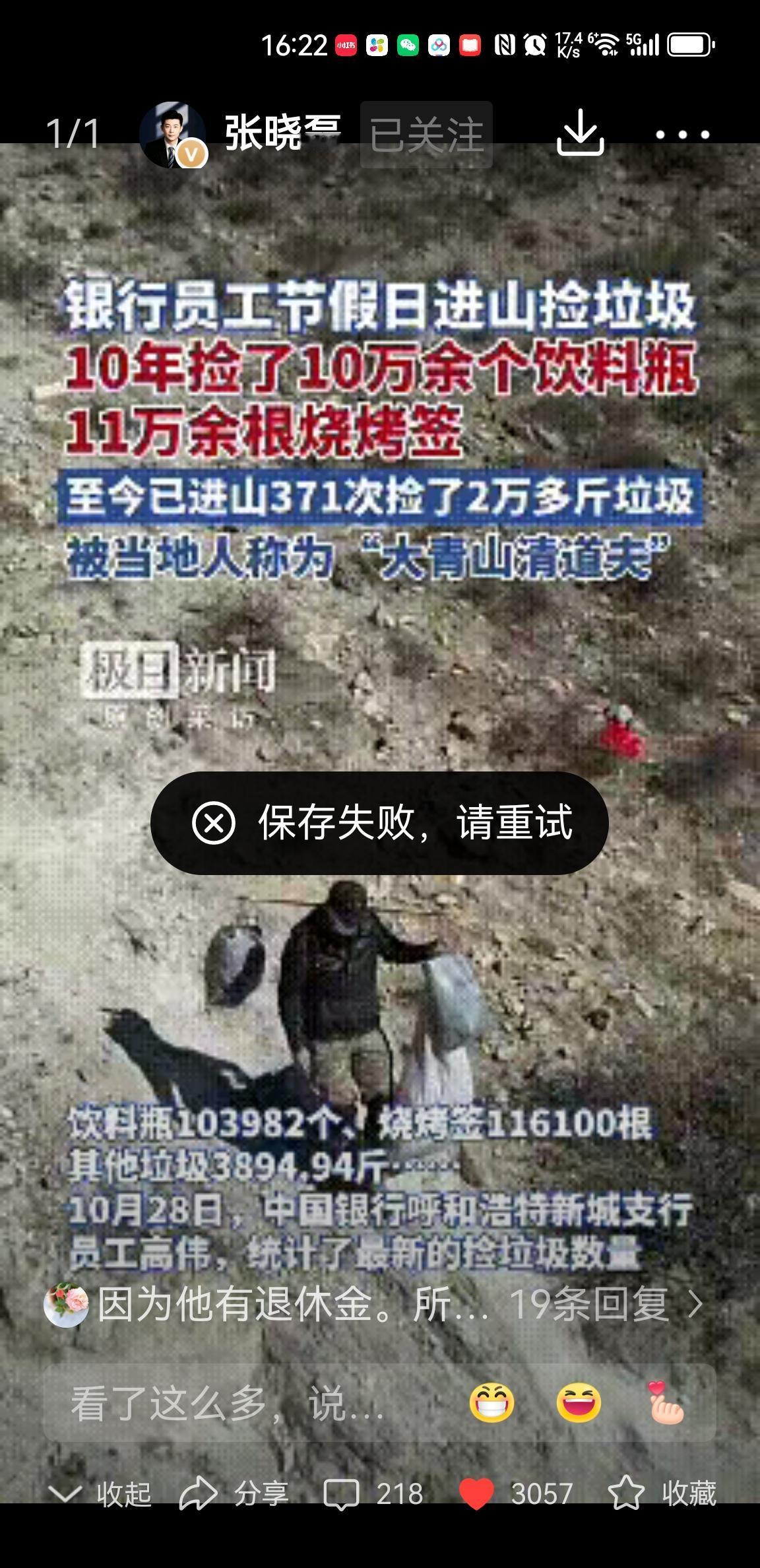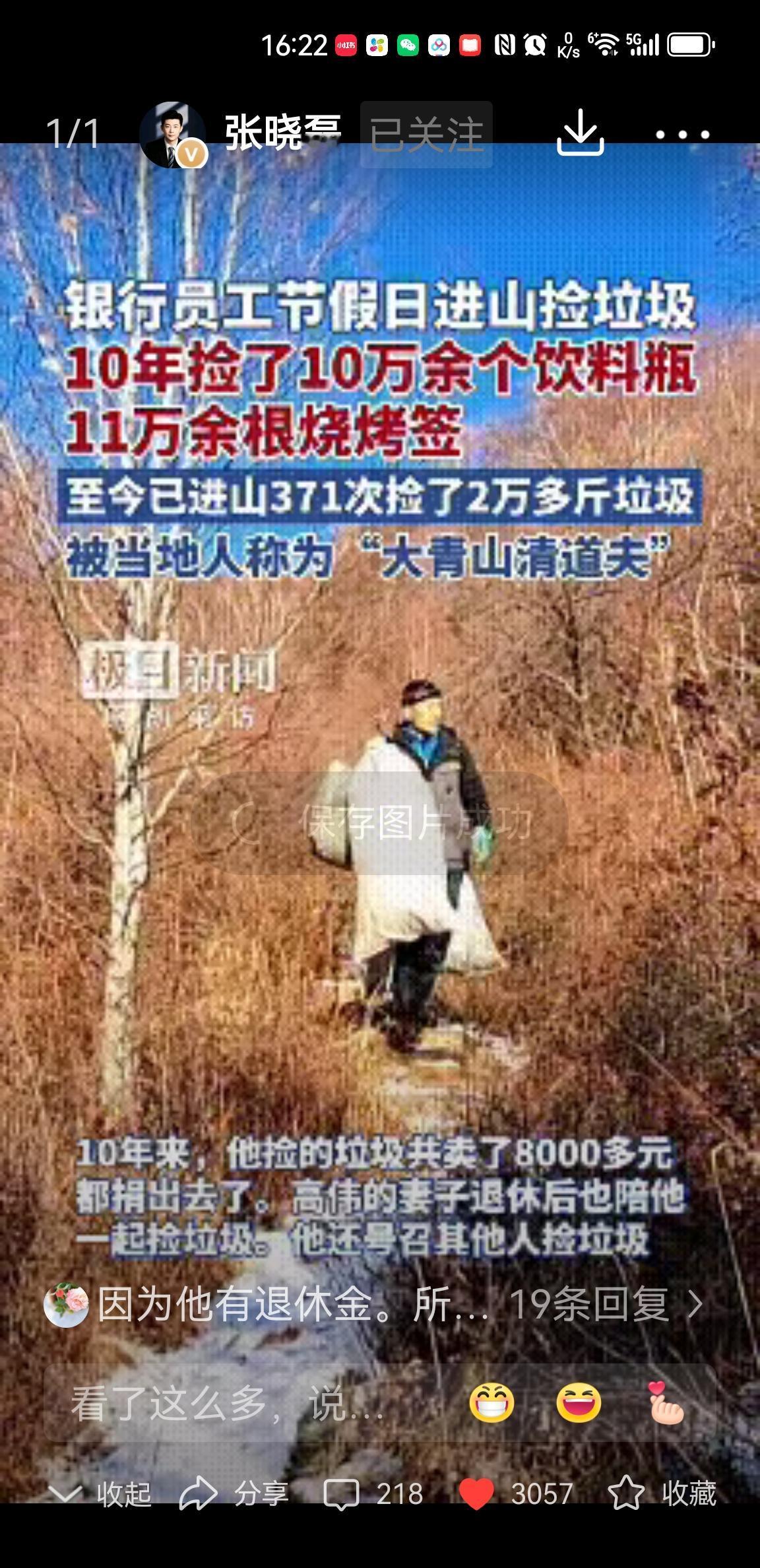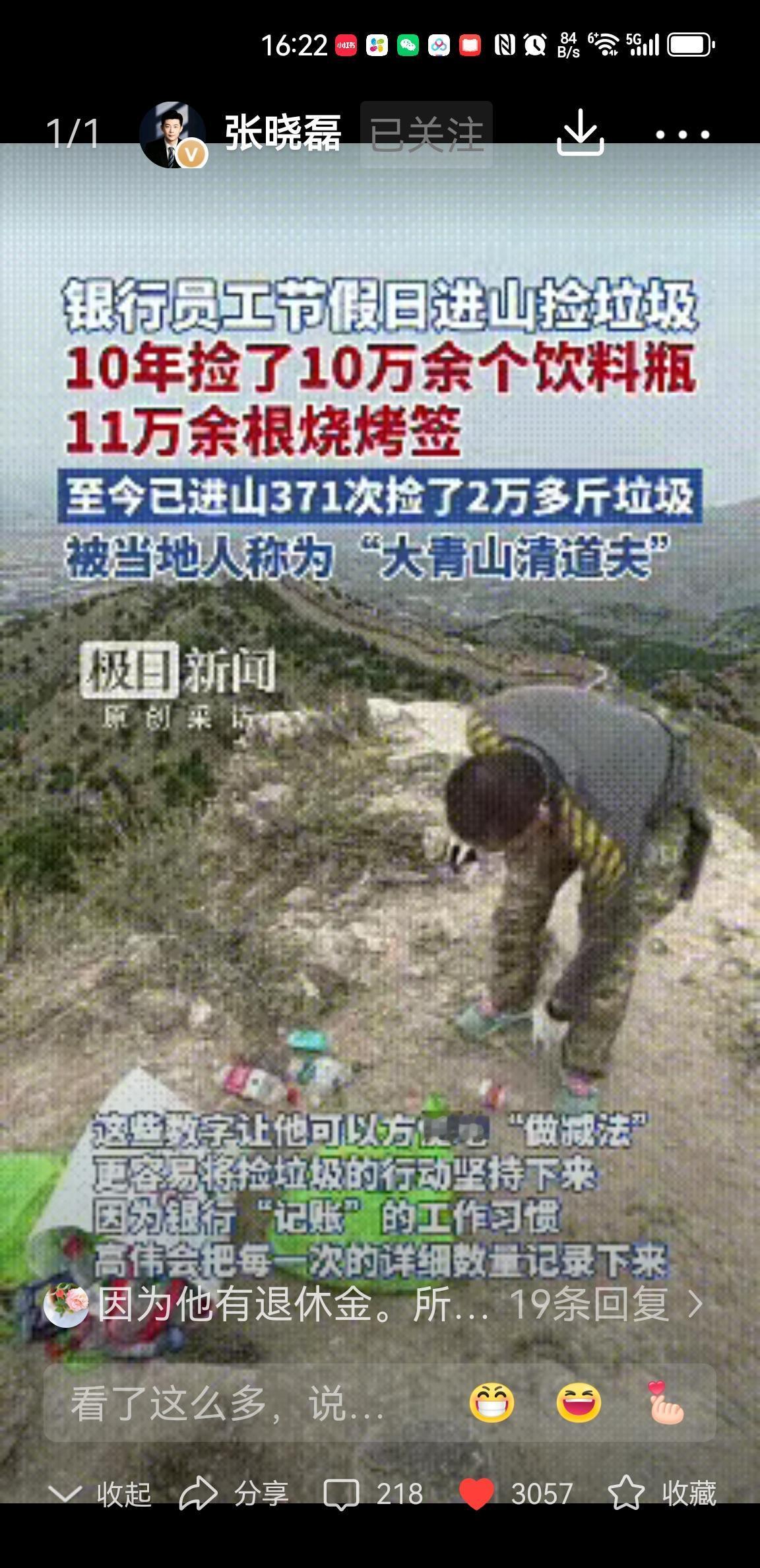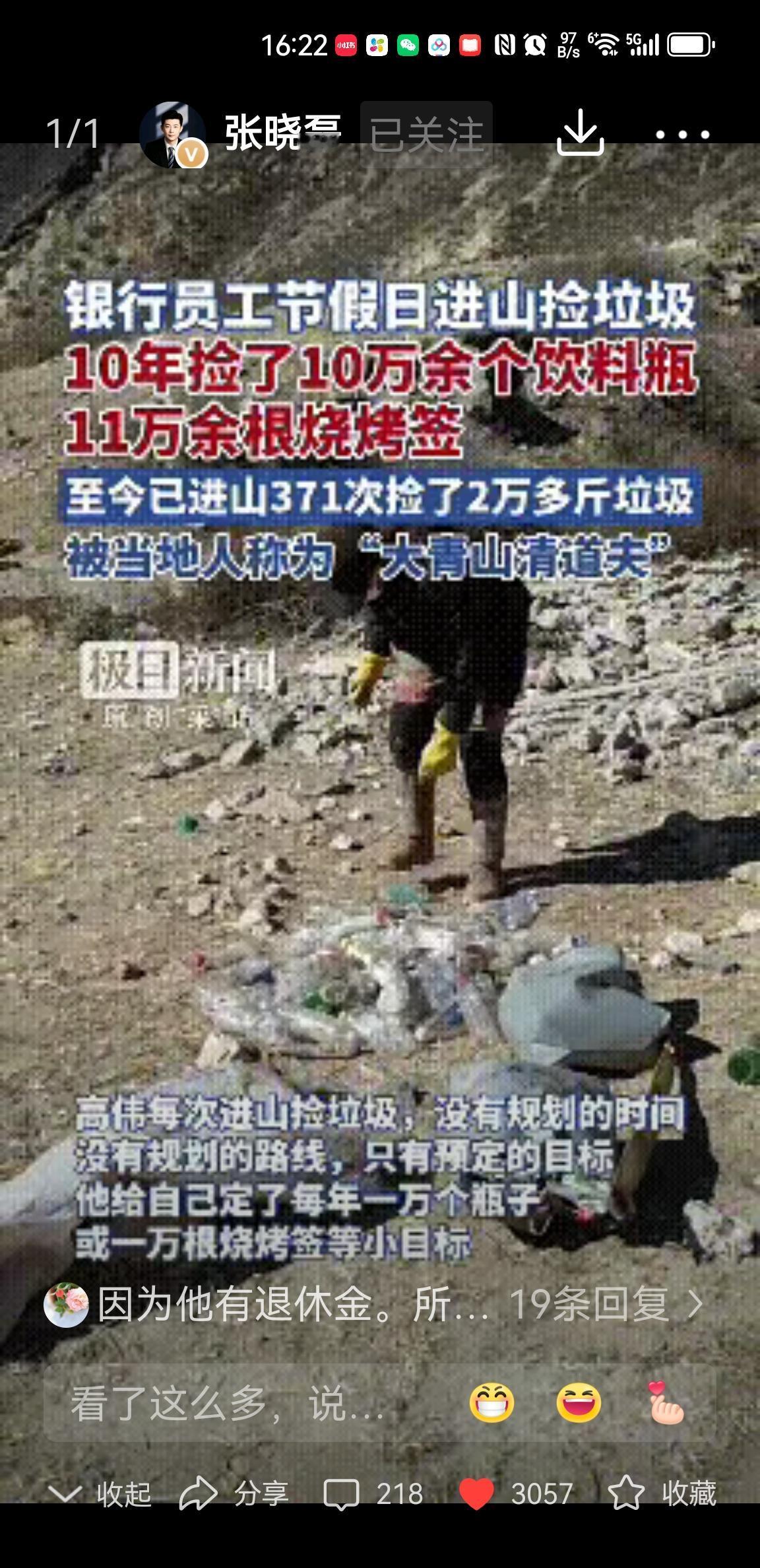这下可好了,不仅内蒙古,整个全国都知道了! 原因很简单:一位普通银行员工,用十多年的时间,演绎了一场“捡垃圾”的温暖行动,感动了无数人。 他叫高伟,一个普通得不能再普通的名字,但他的故事却像一股清流,直击人心。每到放假,他都跑到山里去,不是为了旅游,也不是为了放松,而是为了“捡垃圾”。十几年间,他一共进过山371次!这可不是开玩笑,而是用行动证明:只要心在,就没有做不到的事。 他的目标很简单:每年捡一万瓶塑料瓶,或者一万根烧烤签。听起来很“平凡”,但坚持十几年,这份坚持就变得不平凡。经过多年的努力,他捡的垃圾总重量超过两万斤!这些“废品”最后都变成了钱,他把赚来的全部都捐了出去——没有一分钱留给自己。 更令人敬佩的是,他还经常带着身边的朋友、同事一起行动,把这份善意传递开来。这种十年如一日的坚持,既是对环境的守护,也是对生活的热爱,更是对社会的责任感的最好诠释。 有人说,像高伟这样的人不多,但其实,他代表的是一种精神:用行动去影响别人,用坚持去点亮生活。或许我们每个人都没有那么多时间去“捡山里的垃圾”,但只要心存善念,哪怕是一点点的努力,也能汇聚成一股暖流,温暖这个世界。 所以,别小看自己的一点点善意,也许下一次的“善举”,就会像高伟一样,成为一段被传颂的温暖故事。我们都可以成为那个,默默付出、坚持不懈的“环保英雄”。毕竟,生活的美好,不就是在点滴中积累的吗?内蒙古高伟