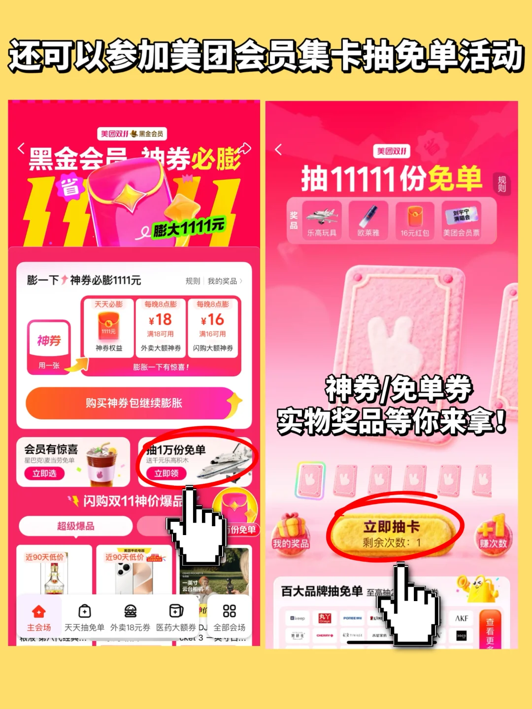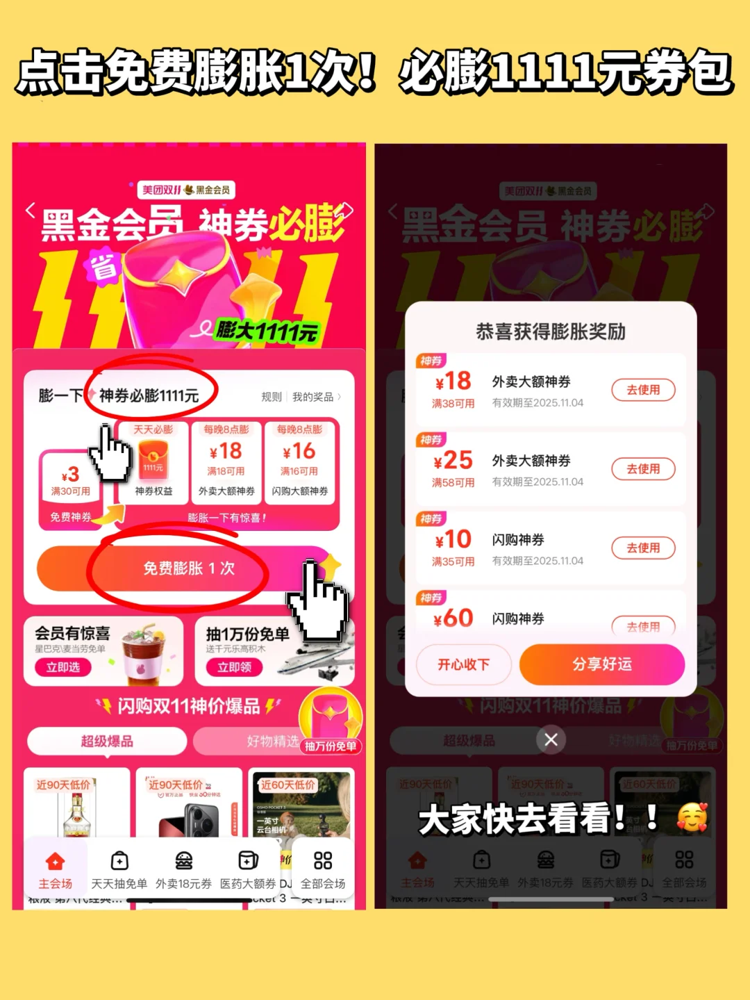 现在-11.7期间,直接点“免费膨胀1次”必膨1111元券包!!