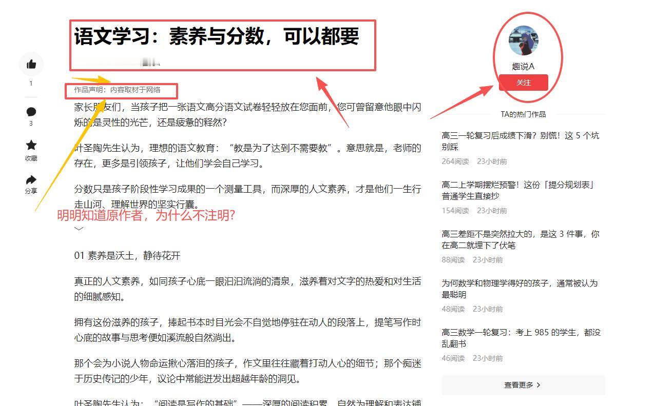 文章被人从百家号搬运到了头条号,一字不改。 这显然就是抄袭,原作者以为声明文章来自网络就可以了吗? 明明知道原作者,为何不注明文章出处? 可是,头条号的抄袭举报之路真的好难好难。 本来很喜欢头条号的平台,这些年为何渐渐不来了? 就是因为不知道自己辛辛苦苦写的东西,会不会被平台珍惜。 我一直觉得头条是公正的,可这次我不信了。 我不知道他们要什么证明,我截图里的内容还不够吗? 只需点开链接查实一下,已经很明了了。 不管,好吧,那我就吐槽一下。