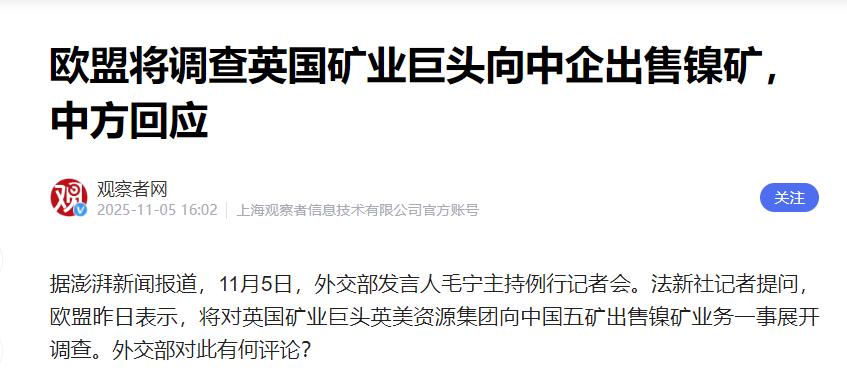 11月5日,欧盟正式宣布,要调查英国矿业巨头英美资源集团把镍矿业务卖给中国五矿集团这事 这操作真让人看不懂 ,2 月就定好的买卖,双方白纸黑字签了协议,五矿实打实拿出 5 亿美元真金白银,现在都快年底了,欧盟才想起要查,这事儿想想就透着蹊跷。 先说说这镍矿到底有多金贵,不是内行可能不知道,这东西可不是普通石头,家里的不锈钢锅碗瓢盆、医院的手术刀、还有现在到处跑的新能源汽车电池,都离不了它。 五矿买的这俩巴西矿山,Barro Alto 和 Codemin,光是已探明的镍储量就有 520 万吨,全球排第三,一年能产 4 万吨镍铁,就拿今年三季度来说,光 Barro Alto 一个矿就产了 8200 吨镍铁,Codemin 也有 1900 吨,是欧盟不锈钢厂的 “粮袋子” 没错了。 欧盟说担心垄断、怕断供,这话听着有理,实则站不住脚。首先这矿是英国公司的资产,英国早就脱欧了,轮得着欧盟来管英中企业的交易? 说白了就是欧盟的《并购控制条例》给了它 “长臂管辖” 的借口,只要觉得影响自己市场,不管交易方是谁都要插一杠子。 再说垄断,是英美资源自己要卖,五矿是正常收购,哪来的垄断?真正的导火索是竞争对手 CoreX 提交了投诉,欧盟就顺着台阶下,把商业纠纷上升到 “供应链安全” 的高度,这心思也太明显了。 更有意思的是,五矿早就拿出了诚意,主动承诺未来十年保证欧盟的镍铁供应量不减少,可欧盟还不依不饶,说这承诺 “不够实在”,非要启动第二阶段调查,摆明了就是故意刁难。 要我说,欧盟根本不是怕断供,是怕中国掌控了镍资源的话语权。现在新能源汽车成了香饽饽,高纯度镍是电池的核心原料,欧盟自己的汽车产业正想发力,要是镍这种关键原料被别人攥在手里,它能不急吗? 咱再说说中国为啥非要买这矿,不是钱多烧得慌,是真的刚需。数据在这儿摆着,2025 年中国镍矿石对外依存度都快到 90.2% 了,国内一年就产 11.3 万吨镍金属,进口却要 4900 万吨,大部分得从印尼、菲律宾买。 以前依赖菲律宾,可那儿的矿品位越来越低,从 2018 年的 1.8% 降到现在 1.51%,还老搞环保整顿,供应一点不稳妥。 印尼虽然产量大,但早就不让卖原矿了,只能买加工后的镍铁,成本蹭蹭涨。五矿花 5 亿美元收购,就是为了给国内的镍供应多找个靠谱的来源,这是再正常不过的企业战略。 说起海外收购,五矿可不是新手,更不是那种强买强卖的主儿。2009 年金融危机的时候,五矿花 13.86 亿美元收购澳大利亚 OZ 矿业,当时对方都快破产了,是五矿伸出援手,不仅保留了全部外籍管理团队,还承诺提供资金支持,结果两年就收回了投资,现在那家公司还运营得好好的。 还有 2012 年收购刚果(金)的 Anvil 矿业,也是顺顺利利,靠的就是尊重当地规则、合作共赢的诚意。这些事儿摆出来,谁能说五矿是来 “抢资源” 的? 欧盟自己心里门儿清,镍资源早就不是以前的格局了。印尼现在一年产 220 万吨镍,占了全球一半还多,欧盟自己的镍供应本来就没优势,现在眼看中国通过海外布局慢慢稳住供应,它就坐不住了,想靠调查来阻挠。 可市场规律不是谁想拦就能拦住的,中国企业要保障资源安全,欧盟要护着自己的产业,这本没错,但用 “长臂管辖” 的手段搞政治干预,就太不地道了。 现在欧盟把调查期限定到 2026 年 3 月,说白了就是想拖,想逼着五矿让步。但五矿这步棋下得稳,一方面有过往成功并购的经验,知道怎么跟海外监管打交道;另一方面国内市场有实实在在的需求,就算短期受点影响,长期来看这笔收购对保障镍供应链太重要了。 欧盟要是真把路走死了,最后可能反噬自己 —— 现在不锈钢厂等着镍铁开工,新能源汽车产业等着电池原料,真要是供应出了问题,最先受损失的还是欧洲自己的企业。 说到底,这事儿根本不是什么反垄断调查,就是全球新能源产业竞争背景下的资源博弈。镍这种关键矿产,谁掌握了供应,谁就掌握了产业发展的主动权。 欧盟怕中国占了先机,才急着跳出来用行政手段干预正常商业交易,可这种做法违背了市场规则,也寒了跨国企业的心。五矿既然敢花 5 亿美元出手,肯定早有准备,咱们等着看,最后谁能笑到最后。