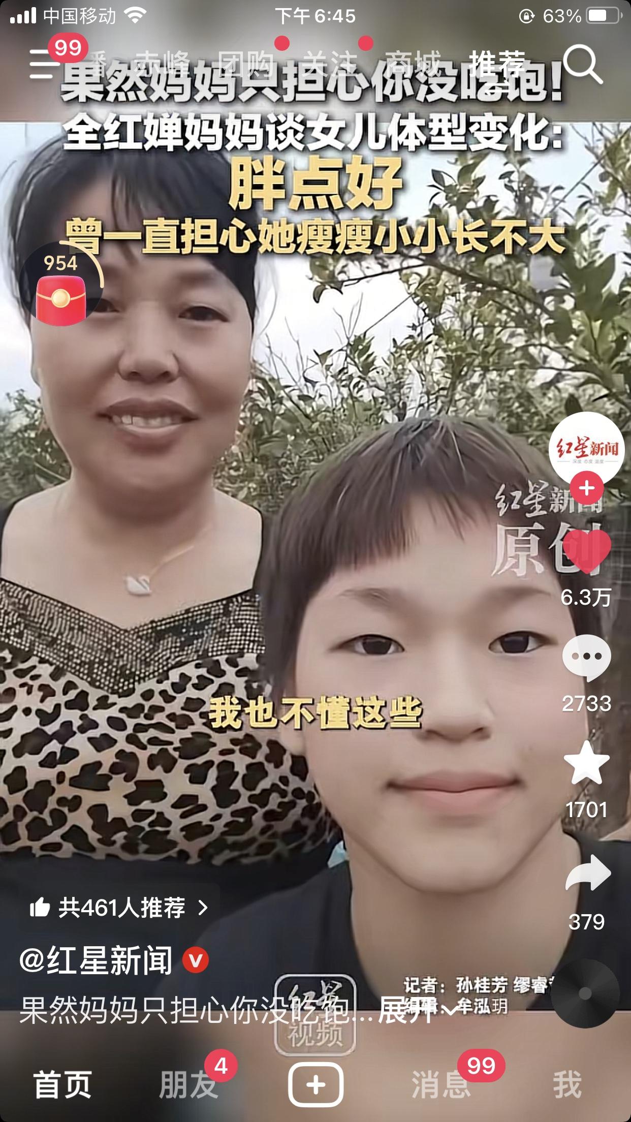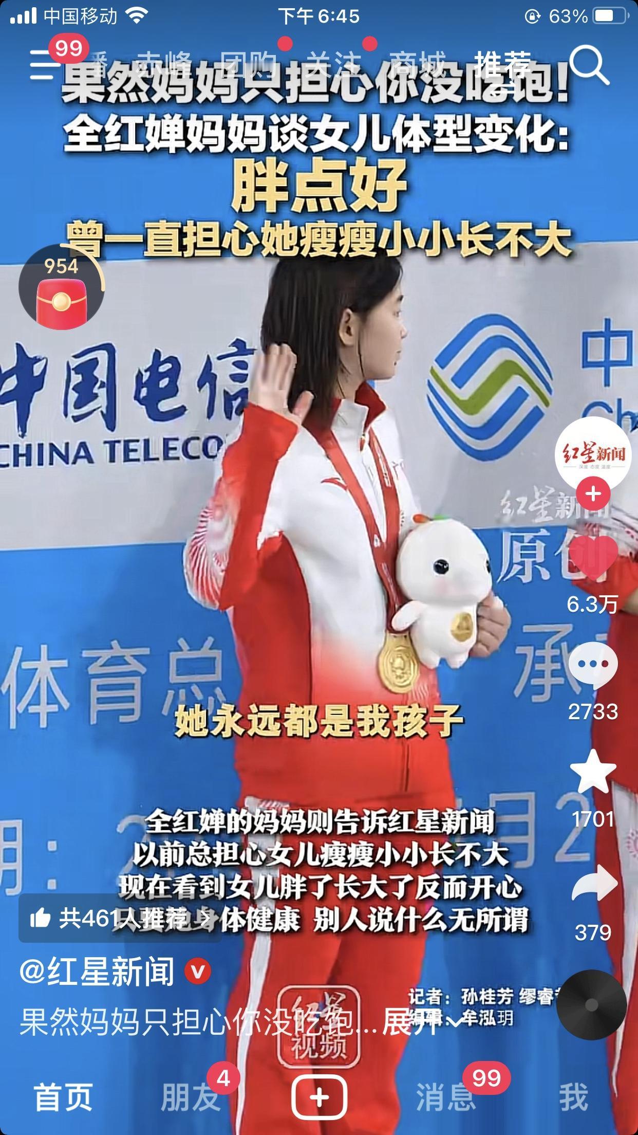 全红婵妈妈说以前一直担心婵宝瘦瘦小小的,只要身体健康胖一点无所谓。女儿每次都是报喜不报忧,每月坚持给爸爸妈妈生活费。 感觉全红婵才18岁但忠义孝悌已全,对得起祖国,对得起教练对得起父母,对得起自己,胖瘦都无所谓了健康开心就好。 能長高長大是好事,是一辈子的好事。运动生涯毕竞很短暂,曾经站在最闪亮的高点,已无遗憾。