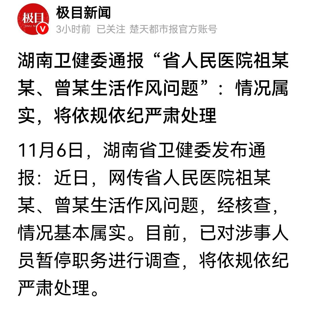 湖南省卫建委!没护犊子,反应神速。 网传省人民医院,祖院长、曾主任,生活作风问题,属实。 他俩的职务被暂停,接受调查, 依法依规严肃处理。 职务肯定是玩完,医生资格能不能保住还两说。 这下玩大了,家庭事业,前途未卜。🫢