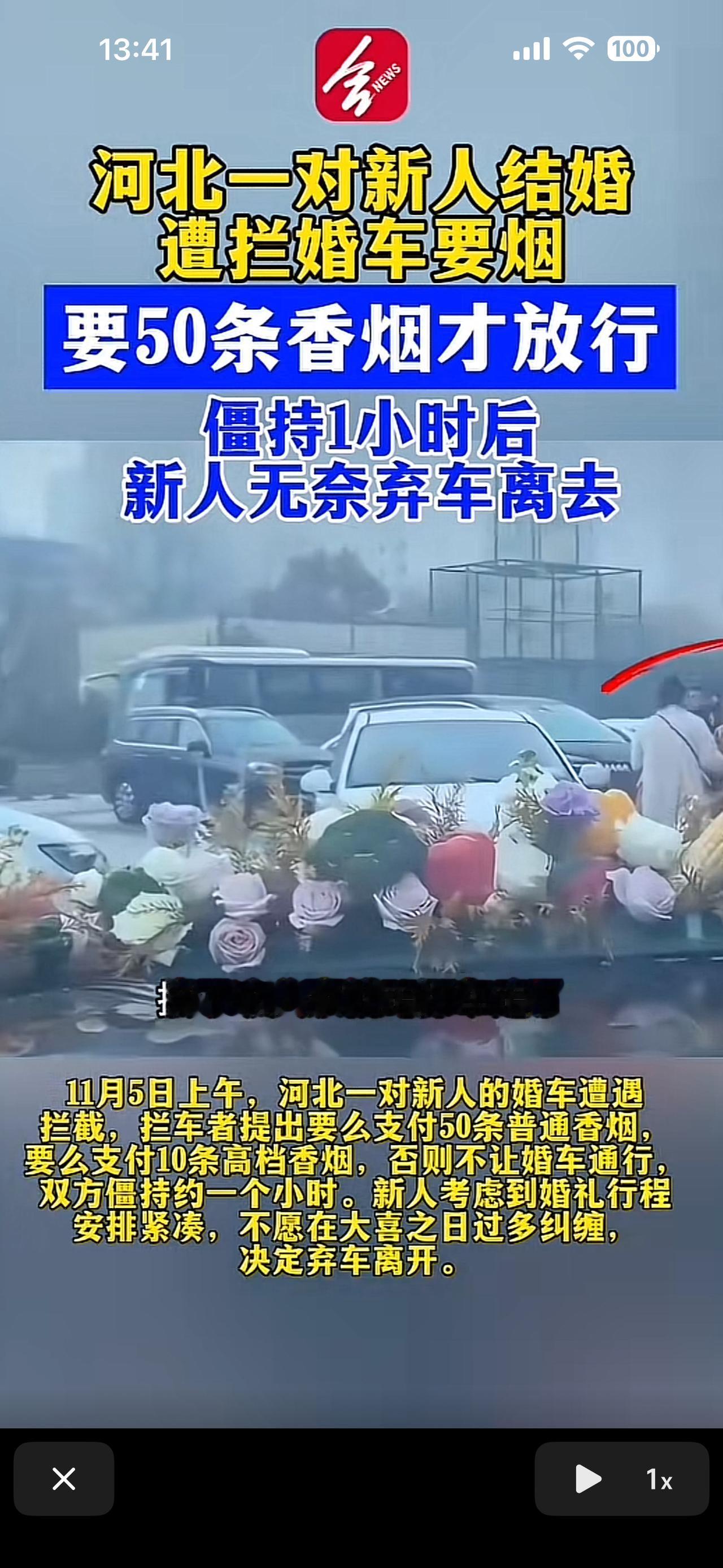 我的今日状态:😁轻松愉快 我这里的天气:☀️晴天 婚闹何时消?近期河北一对新婚夫妻结婚💒,遭遇7-8人开车🚗将其拦截。索要10条最贵香烟或50条普通烟。僵持接近1小时后,新人无奈弃车离去。 新人考虑大婚之日,行程安排很紧,不愿意过多纠缠,直接下车打车离开。 小编想说,很多人就是抱着这种思想来进行打劫,希望当地民俗和警察要严厉打击!针对此事,大家怎么看?河北结婚