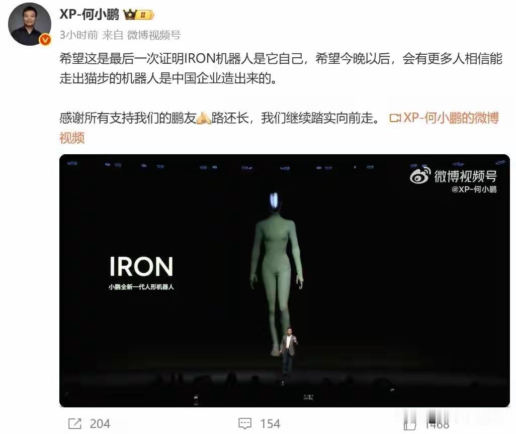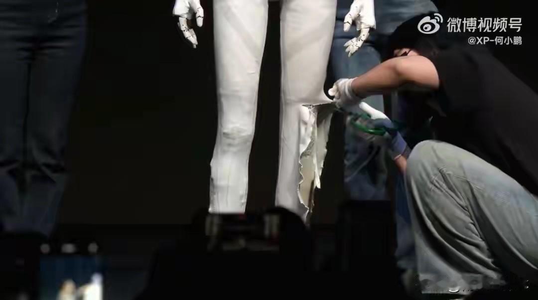 看到何小鹏剪机器人的裤腿时, 我就在想, 有没有更好的证明办法呢? 比如说,可以让光秃秃的机器人上台,在现场直接把外衣给套上,再让机器人做动作。 又比如说,不要剪裤腿这样无关紧要的地方,可以剪开脖子这里的布料,因为已经有网友说了,就算露出了机械腿,也有可能是装了义肢的残疾人假扮的。 再比如说,安排机器人做几个就算是骨骼惊奇的人也无法完成的动作,这样大家会不会觉得更有说服力呢? 但是话说回来,这机器人走起来跟个模特似的,居然还扭胯,真的很难不让人怀疑到底是不是真人扮演的? 你们觉得呢?