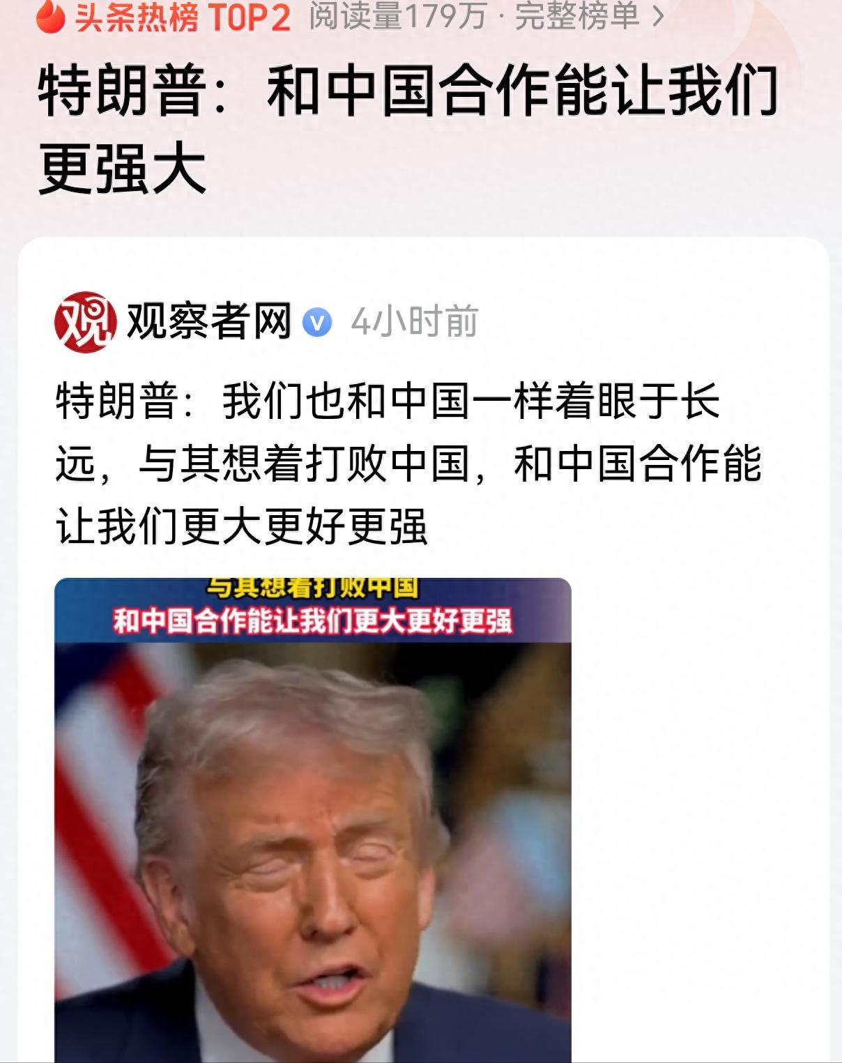 特朗普开窍了,今天他在接受电视采访时说,我们也要像中国一样着眼于长远,与其想着打败中国,和中国合作能让我们更大更好更强,他去了一趟韩国,认识提高的挺快。明年来中国,四处转转,思想还会上台阶! 这话一出,不少人都觉得意外。要知道以前提起中国,他常挂在嘴边的都是强硬应对的话,如今 180 度转弯,连竞争对抗、脱钩断链都没提。 当地时间 11 月 2 日,美国哥伦比亚广播公司播出了这篇专访,他直言和中国好好相处比对着干强,符合美国的利益。 去韩国转了圈,算是让他真真切切开了眼。 当地半导体企业跟中国合作后,生意火得肉眼可见,仁川港和中国港口配合着干活,装卸速度都快了不少。 这种实实在在的好处,比任何口号都有说服力,也让他看清了现在各国做生意早就绑在一起的现实。 美国这边的情况其实早就等不起了。 前阵子贸易摩擦闹得凶,美国大豆对华出口暴跌,今年前八个月出口量少了七成多,9 月更是一粒没卖出去,仓库里的粮食堆得都要发霉了。 农民们贷款还不上,日子过得挺难,而中国每年要进口一亿吨大豆,正是他们最需要的大市场。 好在中美已经谈出了结果。10 月底吉隆坡磋商后,釜山会晤又敲定了细节,最快下周就能签协议。 中国今年内会买 1200 万吨美国大豆,未来三年每年都保持 2500 万吨的采购量,还会合作阿拉斯加的能源项目,既帮美国农民清库存,也能稳定国内物价。 可这边刚有好消息,美国财长就出来唱反调。 同样在 11 月 2 日,他放话要是中国限制稀土出口,就加征关税。中方发言人直接回应,威胁没用,对话才是正道,两国元首定好的共识得好好落实。 其实美国老百姓早就受够了关税,之前加税让每个家庭每年多花上千美元。 台海那边也有新动静。 中美釜山会晤没谈台湾问题,美国学界和军火商都觉得不该介入,民进党当局却急着搞事情,注销有大陆身份证的台湾民众户籍。 国台办近期明确说了,会推进两岸融合发展,让台胞在大陆享同等待遇,祖国统一是大势所趋。 现在大家总算看明白了,特朗普的转变不是心血来潮,是现实摆在那。 毕竟美国企业离不开中国市场。 国家之间的合作,说到底都是为了老百姓过好日子。 美国农民盼着粮食卖出去,中国消费者需要稳定的农产品供应,工人希望有稳定的工作,这些都不是靠对抗能实现的。 美国内部的分歧其实很简单,就是有人没算明白经济账。 加关税看似强硬,实则让自己人吃亏,企业成本涨、消费者花钱多、农民卖不出货。 反观合作带来的好处,看得见摸得着,既解决库存问题,又能拿到便宜能源,还能带动相关产业就业。 对咱们普通人来说,这些国际合作离生活一点都不远。 超市里的豆油价格稳了,买东西选择多了,相关产业的就业机会也会增加。 两岸融合发展让台胞能共享发展机遇,大家日子都能越过越好,这才是最实在的好处。 特朗普的转变让中美关系多了份盼头,不管背后有多少考量,愿意合作就是好事。 只要朝着互利共赢的方向走,不管遇到什么分歧,都能坐下来谈明白。 毕竟,没有哪个国家能孤立发展,互相成就才是长久之道。 信源:环球网——《特朗普:我们也和中国一样着眼于长远,与其想着打败中国》