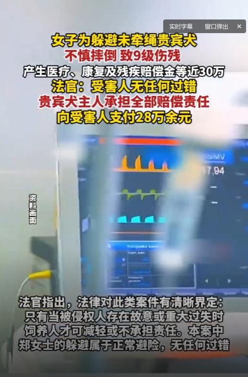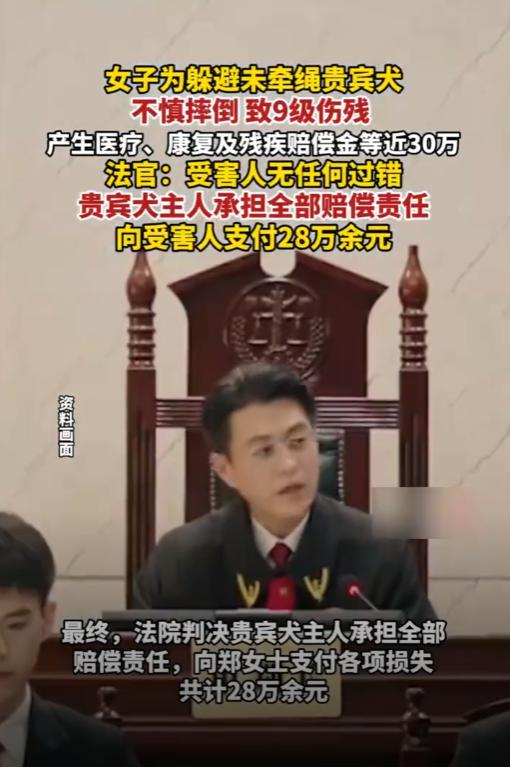“大快人心!”近日,江苏常州,一女子在早上晨练后准备回家,谁知在路上突然窜出一条没牵绳的贵宾犬,女子吓得赶紧躲避,不曾想却摔倒在地,导致九级伤残!女子气的将贵宾犬主人告上法庭,法官直接判决狗主人赔偿28万!   清晨的阳光刚洒向江苏常州的街头,市民郑女士结束晨练准备回家,一场突如其来的意外打破了这份宁静。   在一片草坪旁,一条未系牵引绳的贵宾犬突然窜出,为了躲避这只猛然出现的宠物,郑女士下意识向旁边避让,却不慎摔倒在地。   这一摔,让她遭遇了二椎体压缩性骨折,经专业机构鉴定构成九级伤残,后续的治疗、康复以及残疾赔偿金等各项费用累计接近30万元。   事故发生后,郑女士与犬只主人顾女士就赔偿事宜展开沟通,然而双方在金额上始终无法达成一致,多次协商均以失败告终。   在私下调解无望的情况下,郑女士选择通过法律途径维护自身权益,将顾女士告上法庭。   这起看似普通的饲养动物损害责任纠纷,最终由江苏常州市中级人民法院公开宣判,判决顾女士承担全部赔偿责任,向郑女士支付各项损失共计28万余元。   这一判决不仅回应了当事人的诉求,更向社会传递出明确的信号:养犬绝非随心所欲的私事,而是必须恪守法律边界的责任。   近年来,各地频繁发生未牵绳犬只致人伤害的事件:大型犬失控冲撞路人造成十级伤残,小型犬追逐行人引发电动车侧翻事故,这些案例背后都隐藏着同样的根源——养犬人对安全管理义务的漠视。   不少犬主抱有“我的狗不咬人”的侥幸心理,却忽略了动物行为的不可预测性,即便没有发生直接的撕咬行为,犬只的突然窜动、追逐也足以引发他人恐慌,进而导致意外发生。   更有甚者,部分养犬人完全忽视邻里权益,任由宠物频繁吠叫干扰他人休息,遛狗时随意丢弃粪便污染环境,这些不文明行为早已成为影响社区和谐的顽疾。   我国法律对饲养动物致人损害的案件有着清晰的界定。   《中华人民共和国民法典》明确规定,饲养动物造成他人损害的,饲养人或者管理人应当承担侵权责任,除非能够证明损害是因被侵权人故意或者重大过失造成的。   在这起案件中,郑女士的避让行为属于面对突发危险时的本能反应,主观上不存在任何过错,自然无需承担责任。   而顾女士未按规定为犬只拴系牵引绳,违反了最基本的安全管理义务,是导致事故发生的唯一且根本原因,理应对郑女士的全部损失承担赔偿责任。   此外,新修订的《治安管理处罚法》也已明确对遛狗不牵绳的行为制定了相应的处罚措施,从立法层面进一步压实了养犬人的责任。   不得不说,28万元的赔偿判决给所有养犬人敲响了警钟。   这一数字背后,是受害者身体的伤痛、经济的损失,也是对养犬人漠视规则的严厉惩戒。   文明养犬从来都不只是道德层面的倡导,更是不容推卸的法定义务。   一根牵引绳看似细小,却承载着对他人安全的保障,也守护着养犬人的自身权益。   现实中,正是因为部分养犬人忽视了这一简单的举动,才让原本可以避免的意外频繁发生,既给他人带来了无法挽回的伤害,也让自己陷入了法律纠纷和经济赔偿的困境。   养犬自由的边界,永远是他人的安全权益。   在城市公共空间中,每个公民都享有平等的安全保障权,这种权利不应因少数人的疏忽而受到损害。   作为养犬人,主动为宠物牵绳、佩戴嘴套,及时清理粪便,不仅是遵守法律规定的表现,更是尊重他人、承担社会责任的体现。   唯有每一位养犬人都树立起牢固的责任意识,恪守法律底线,才能从根本上杜绝类似悲剧的发生,让人与宠物在城市中和谐共处,共同维护安全有序的公共环境。   毕竟,当我们享受养宠带来的乐趣时,绝不能以牺牲他人的安全为代价。   今天的分享到这里就结束了,大家对此事有何看法,欢迎在评论区留言和讨论,感兴趣的可以点击头像加关注,我将每日更新优质内容,我们下期见。