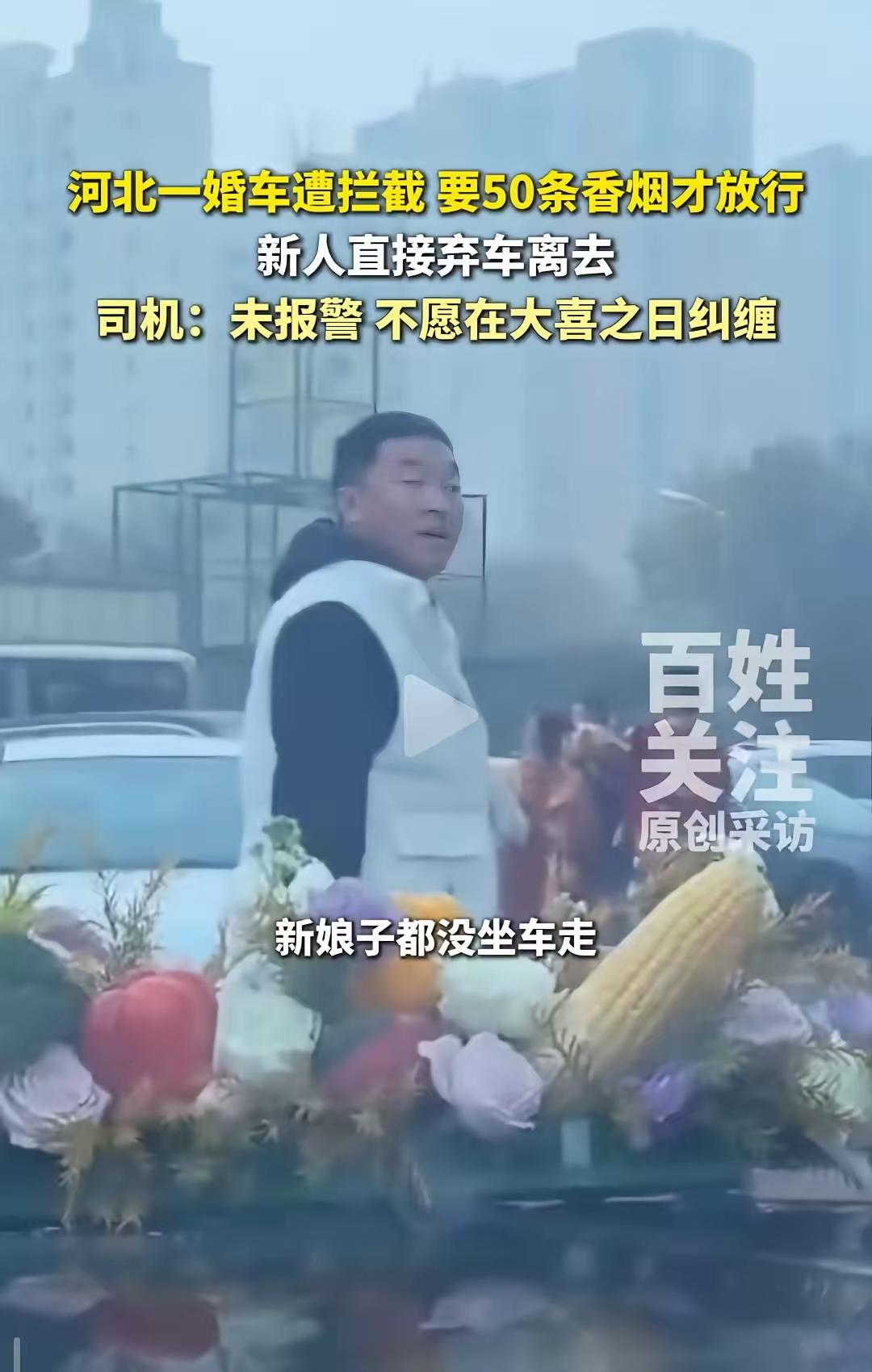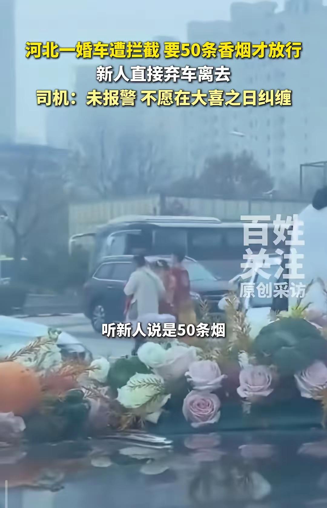 必须严惩!河北婚车遭拦索50条烟,新人弃车打车,这哪是讨喜分明是抢劫! 结婚本是人生最喜庆的大事,可河北这对新人的婚礼,却被一群“趁喜打劫”的人搅得满是遗憾。11月5日上午,新人的婚车刚准备出发,就被一群人团团围住,张口就要50条普通香烟,要么就换10条高档烟,折算下来价值近6000元,不给就堵路不让走。 婚车司机眼睁睁看着双方僵持了整整一个多小时,新人急得满头大汗,一边是吉时不等人的婚礼,一边是拦车者的蛮不讲理。最后新人实在耗不起,只能无奈弃车,硬生生下车再打车赶往婚礼现场,据说新娘当场被气哭,一辈子一次的婚礼,连婚车都没能坐上,这份遗憾恐怕这辈子都难以释怀。 谁都知道,传统婚俗里拦婚车讨颗喜糖、要个小红包,是邻里亲友间的善意互动,图的是热闹沾喜气。可现在有些人为了钱财,把好好的习俗变成了赤裸裸的勒索,组团蹲守酒店、路口专门盯婚车,用“软胁迫”拿捏新人“怕耽误吉时、不想闹僵”的心理,这早已脱离民俗范畴,纯属违法犯罪。 律师早就明确表态,这种行为根本不是简单的“讨喜”,而是涉嫌敲诈勒索罪或寻衅滋事罪。只要索要金额达到1000至3000元(各地标准略有差异),或者多次实施,就可能面临刑事处罚,要是有拍打车身、拉扯车门等暴力行为,还可能构成抢劫罪,最低可判3年有期徒刑 。河南项城就有先例,一名多次拦婚车索财的男子,先后两次被行政拘留,可见这种行为早该被严惩。 网友们怒不可遏:“这哪是讨喜,分明是抢劫!”“新人的善良不是你们贪婪的底气,习俗更不是违法的遮羞布!”婚礼是人生中最珍贵的仪式,容不得任何人用贪婪践踏。希望当地能严查到底,揪出这些“拦路劫匪”严肃惩治,让变味的“讨喜”无处遁形,也给所有新人一个安心的婚礼环境。 你怎么看待这种拦婚车索财的行为?如果是你遇到这种情况会选择妥协还是报警?欢迎在评论区留下你的观点!