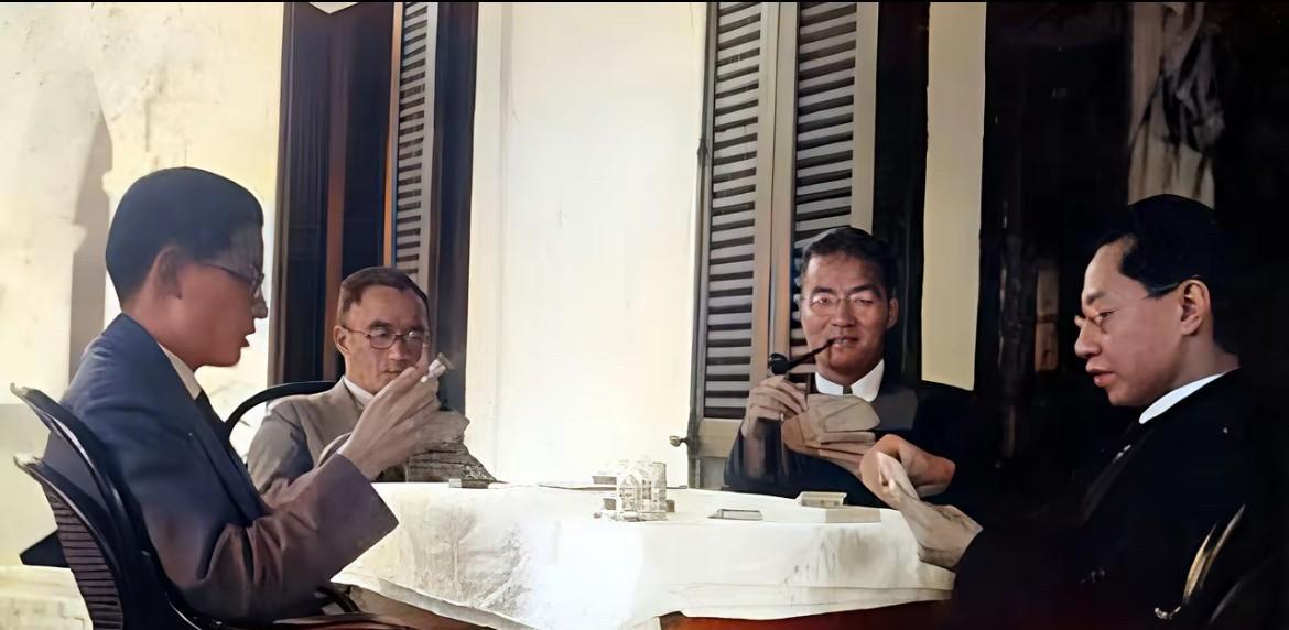 1946年,在抗日战争胜利后、复员北返的清华大学校园里,中文系与历史系的四位著名教授——朱自清、浦江清、邵循正、吴晗在工余闲暇时打桥牌的场景。当时,全面内战尚未爆发,知识分子们沉浸在抗战胜利的喜悦和重建家园的希望之中,心情相对轻松。#历史#