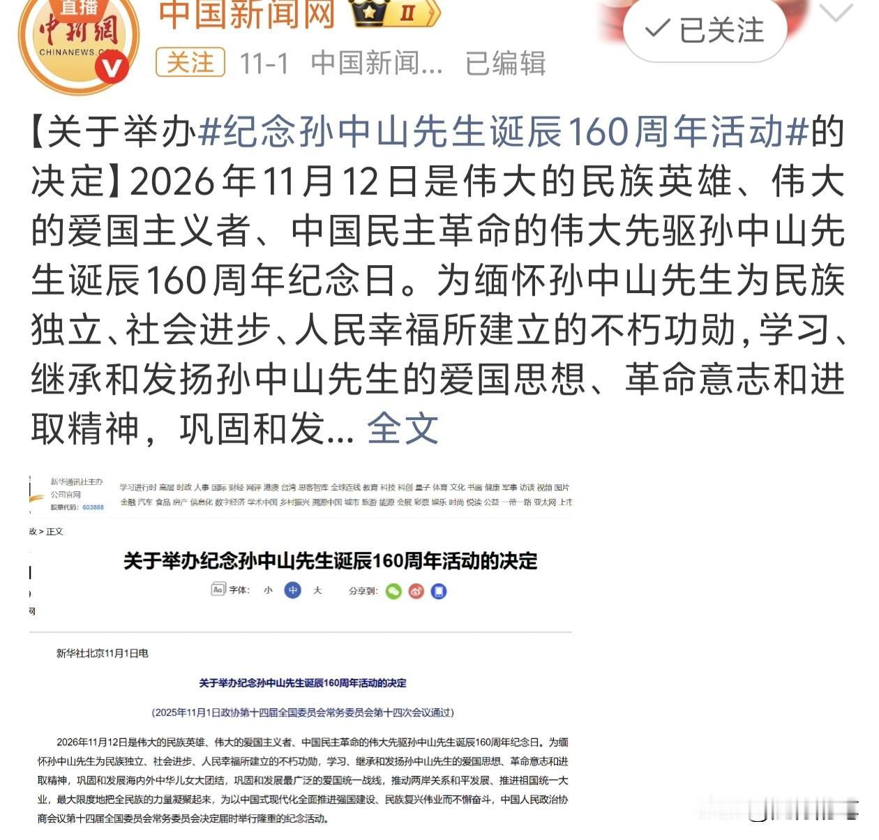 这两天军迷朋友们望眼欲穿的等待福建舰服役的消息,但是却连续两天都秘而不宣。 大家都在猜测到底哪一天宣布。 按照以往的习惯,有重要战略型装备面世或者入列,都会选择在特别的日子公布。不管是以前的歼-20首飞,还是去年底六代机的首飞,决定公布消息的日子,背后都有一个重要的原因。 而这两天并没有什么重要的美国政客访问,所以这个可以排除。 但是,再仔细想想,突然看到日前的一条消息,要隆重纪念孙中山诞辰160周年,日期是在12日。 如果这两天还不公布福建舰服役的消息,有没有可能会选择等到12日再公布呢?